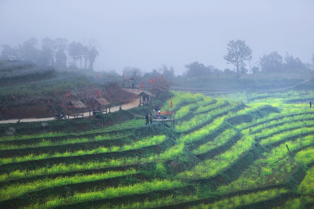 | Những con đường và ruộng bậc thang điểm thêm sắc vàng hoa cải, tạo nên khung cảnh nên thơ giữa núi rừng Tây Bắc |