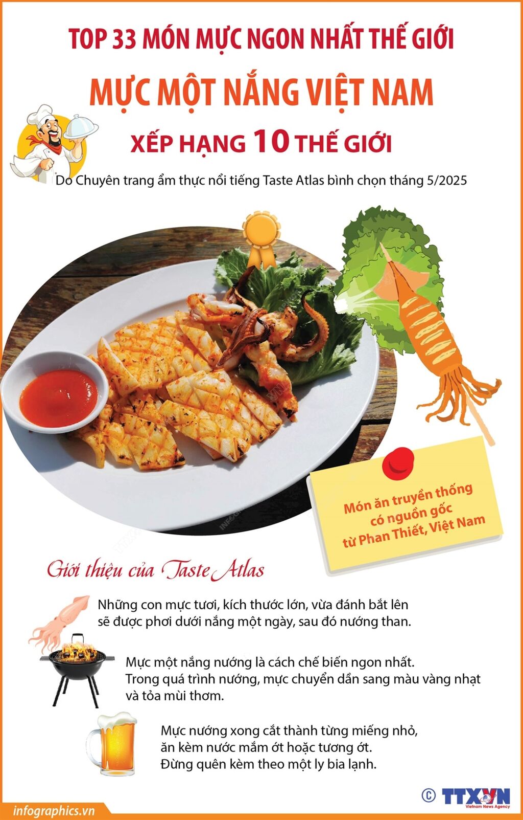Món mực một nắng - đặc sản của Phan Thiết - là món Việt duy nhất trong danh sách những món ăn được chế biến từ mực ngon nhất thế giới, do Taste Atlas bình chọn tháng 5/2025. Taste Atlas là chuyên trang ẩm thực của Croatia, được thành lập năm 2015. Đây được xem là bản đồ các món ăn truyền thống, nguyên liệu địa phương và nhà hàng hàng đầu thế giới, với thông tin về khoảng 10.000 món ăn và hơn 9.000 nhà hàng. Các bình chọn về các món ăn dựa trên bình chọn của độc giả khắp thế giới, và một số chuyên gia.