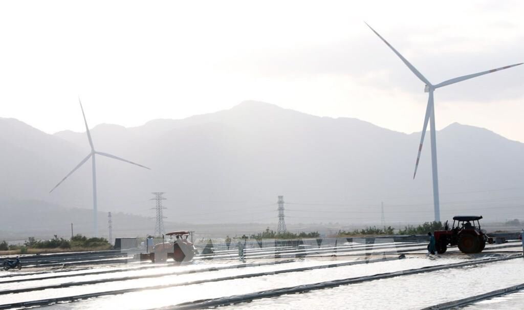 | Các trụ điện gió được xây dựng trên cánh đồng muối ở xã Thuận Nam, tỉnh Khánh Hòa. |