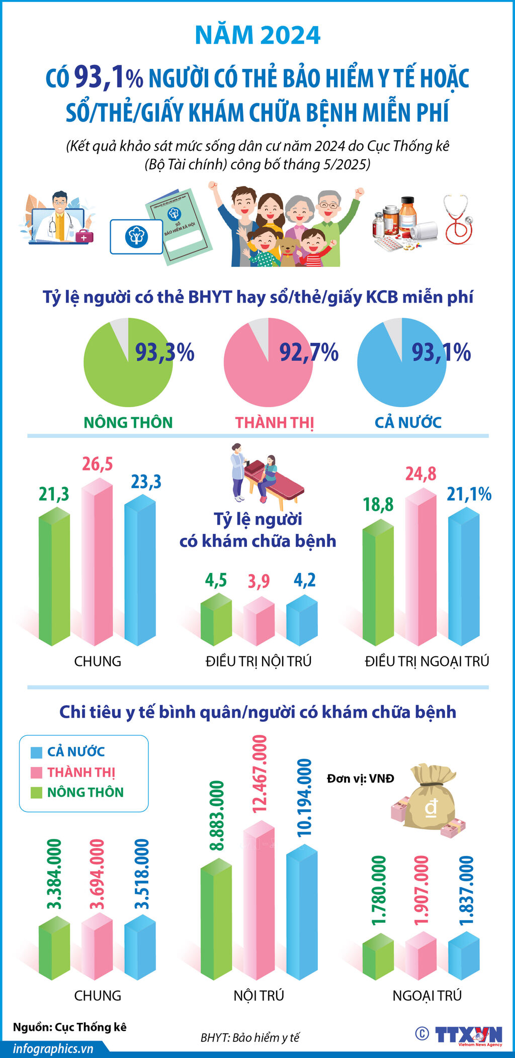| Năm 2024, có 93,1% người có thẻ bảo hiểm y tế hoặc sổ/thẻ/giấy khám chữa bệnh miễn phí |
