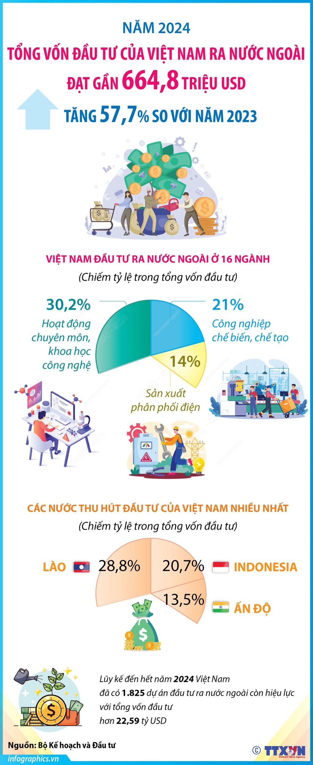 Năm 2024, các nhà đầu tư Việt Nam đã đầu tư ra nước ngoài 164 dự án mới và 26 lượt điều chỉnh vốn đầu tư. Tổng vốn đầu tư của Việt Nam ra nước ngoài đạt gần 664,8 triệu USD (tăng 57,7% so với năm 2023).