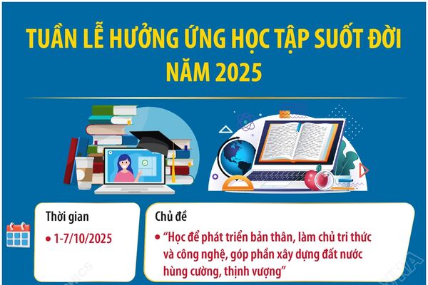 Tuần lễ hưởng ứng học tập suốt đời năm 2025 với chủ đề “Học để phát triển bản thân, làm chủ tri thức và công nghệ, góp phần xây dựng đất nước hùng cường, thịnh vượng” được tổ chức từ ngày 1-7/10; trong đó, lễ khai mạc sẽ được tổ chức đồng loạt tại các địa phương vào ngày 1/10.
