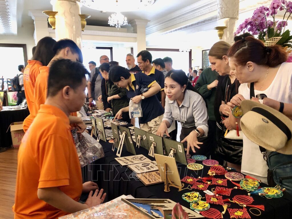 | Du khách quốc tế chọn mua sản phẩm của người khuyết tật. |