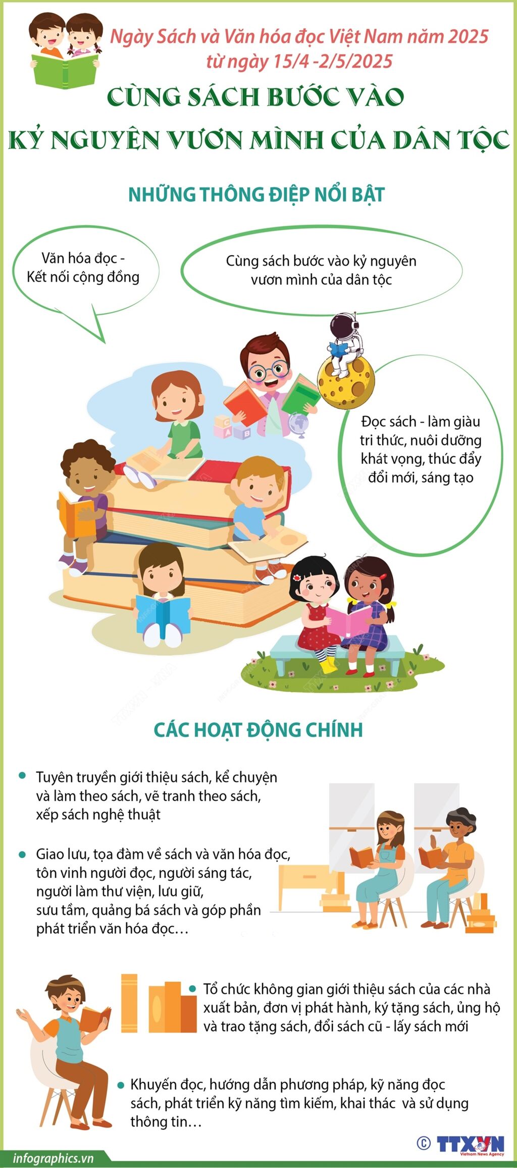 Ngày sách và Văn hóa đọc Việt Nam lần thứ tư năm 2025 do Bộ Văn hóa, Thể thao và Du lịch tổ chức diễn ra trên toàn quốc từ ngày 15/4 - 2/5/2025. Đây là sự kiện thường niên nhằm thúc đẩy phong trào đọc sách, khẳng định vai trò quan trọng của sách trong việc nâng cao tri thức, phát triển tư duy, giáo dục nhân cách và lan tỏa các giá trị văn hóa đến mọi tầng lớp nhân dân. “Văn hóa đọc - Kết nối cộng đồng”, “Cùng sách bước vào kỷ nguyên vươn mình của dân tộc”, “Đọc sách - làm giàu tri thức, nuôi dưỡng khát vọng, thúc đẩy đổi mới, sáng tạo” là những thông điệp của Ngày Sách và Văn hóa đọc Việt Nam năm 2025.