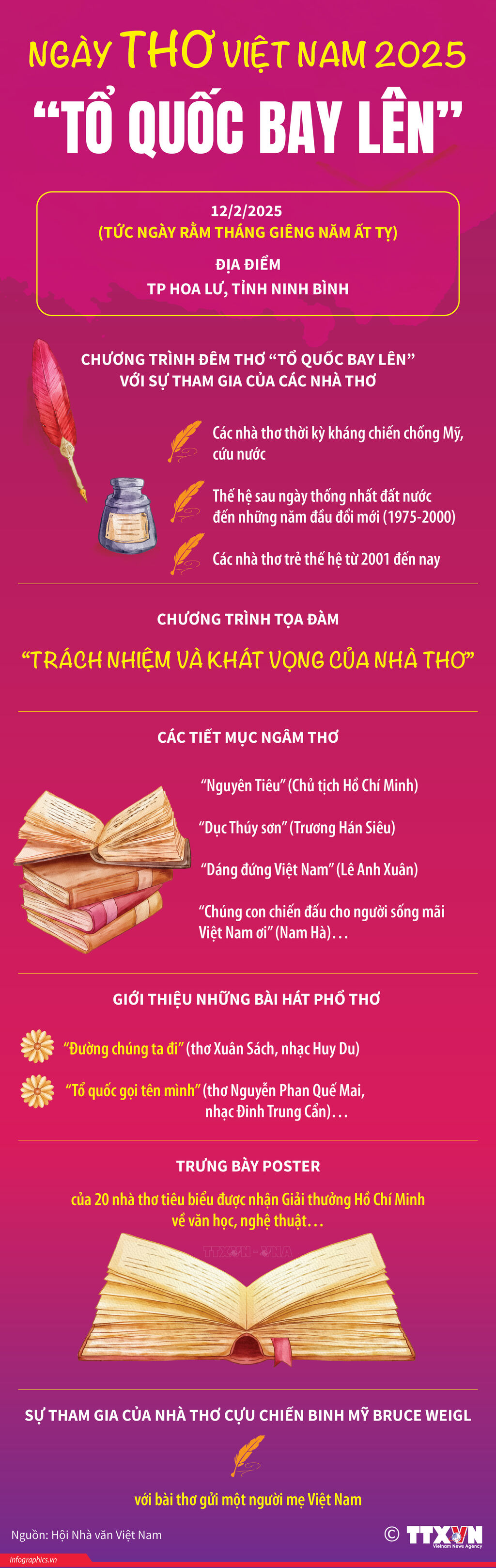 Ngày Thơ Việt Nam lần thứ 23 năm 2025 được tổ chức vào ngày 12/2/2025 (tức ngày Rằm tháng Giêng năm Ất Tỵ) tại TP Hoa Lư (tỉnh Ninh Bình) với chủ đề “Tổ quốc bay lên”, hướng tới kỷ niệm 135 năm Ngày sinh Chủ tịch Hồ Chí Minh (19/5/1890 - 19/5/2025), chào mừng kỷ niệm 50 năm Ngày giải phóng miền Nam, thống nhất đất nước (30/4/1975 - 30/4/2025). Ngày Thơ Việt Nam là dịp để tôn vinh những giá trị văn hóa, khơi dậy tinh thần sáng tạo và khát vọng xây dựng đất nước vững mạnh; đồng thời truyền cảm hứng cho mọi người, đặc biệt là giới văn nghệ sĩ, trong công cuộc sáng tạo và đóng góp vào sự phát triển của xã hội.