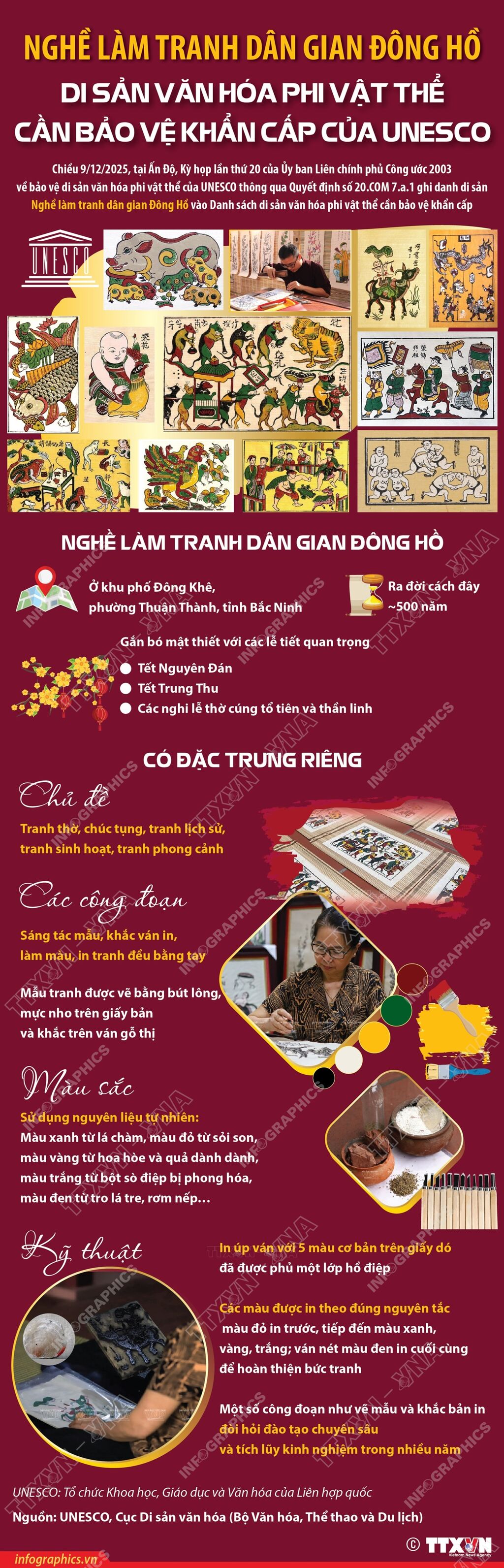 Theo thông tin từ Cục Di sản văn hóa, chiều 9/12/2025, tại Thủ đô New Delhi, Ấn Độ, Kỳ họp lần thứ 20 của Ủy ban Liên chính phủ Công ước 2003 về bảo vệ di sản văn hóa phi vật thể của UNESCO đã thông qua Quyết định số 20.COM 7.a.1 ghi danh di sản Nghề làm tranh dân gian Đông Hồ vào Danh sách di sản văn hóa phi vật thể cần bảo vệ khẩn cấp.