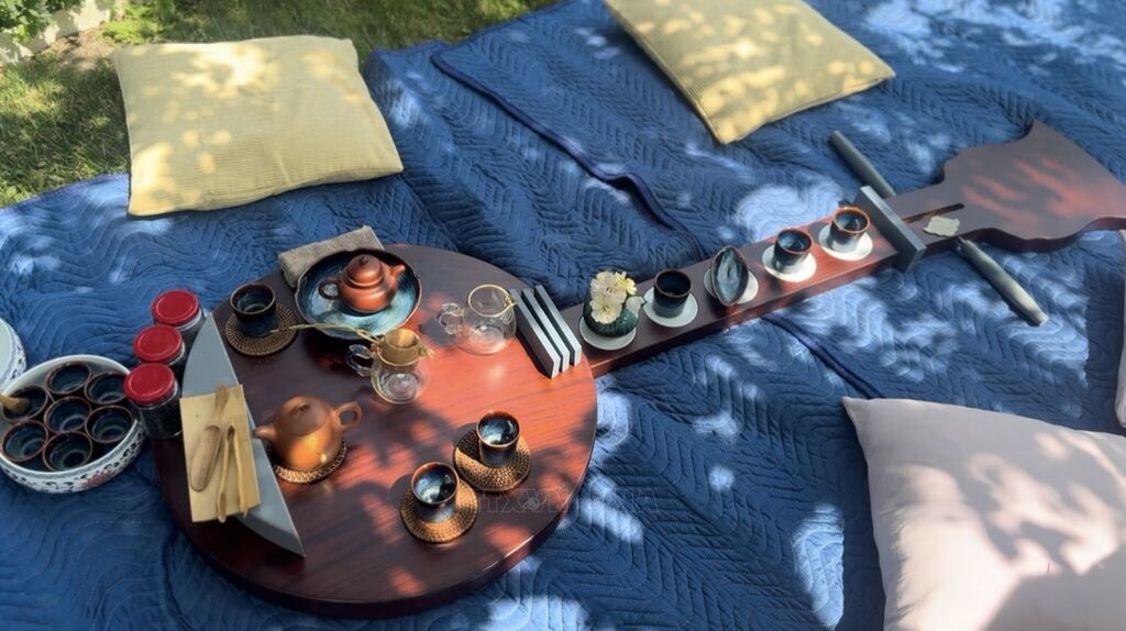 Có 6 yếu tố tạo nên một buổi thưởng trà viên mãn đặc sắc của người Việt Nam, đó là “nhất nước, nhì trà, tam pha, tứ ấm, ngũ nhạc và lục trạch”. Từ “trạch” ở đây chính là không gian thưởng trà và bàn trà là một phần rất quan trọng. Bàn trà được mô phỏng theo hình dáng cây Đàn Nguyệt cũng gợi lên yếu tố “nhạc” và tạo nên vẻ thanh tao trong việc thưởng trà.