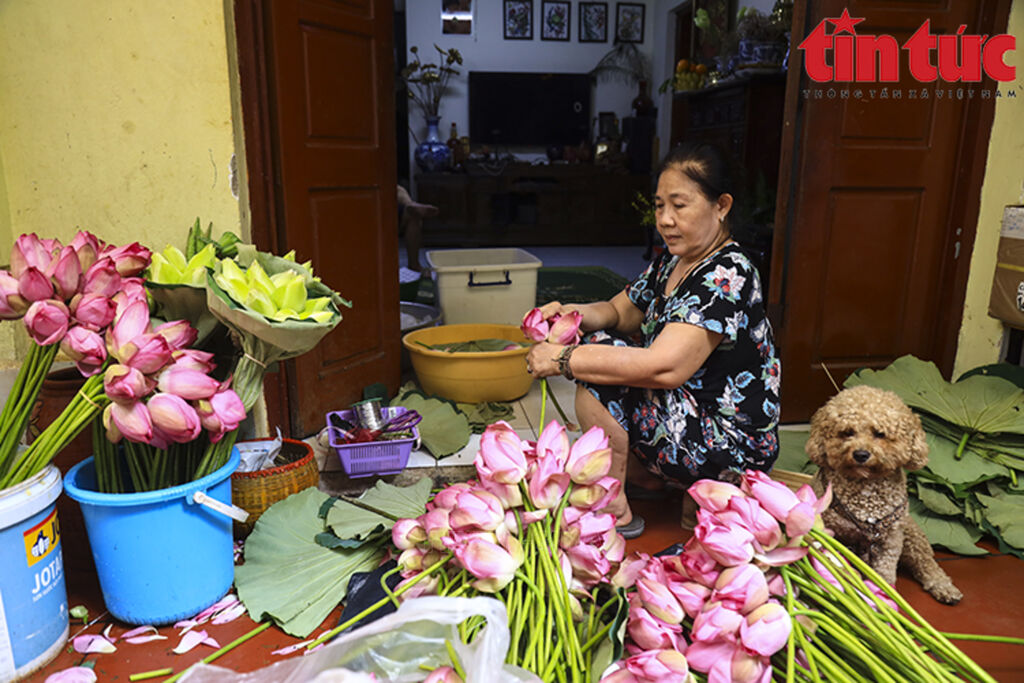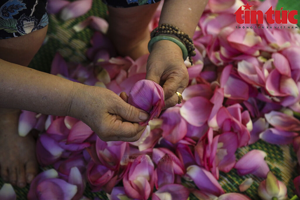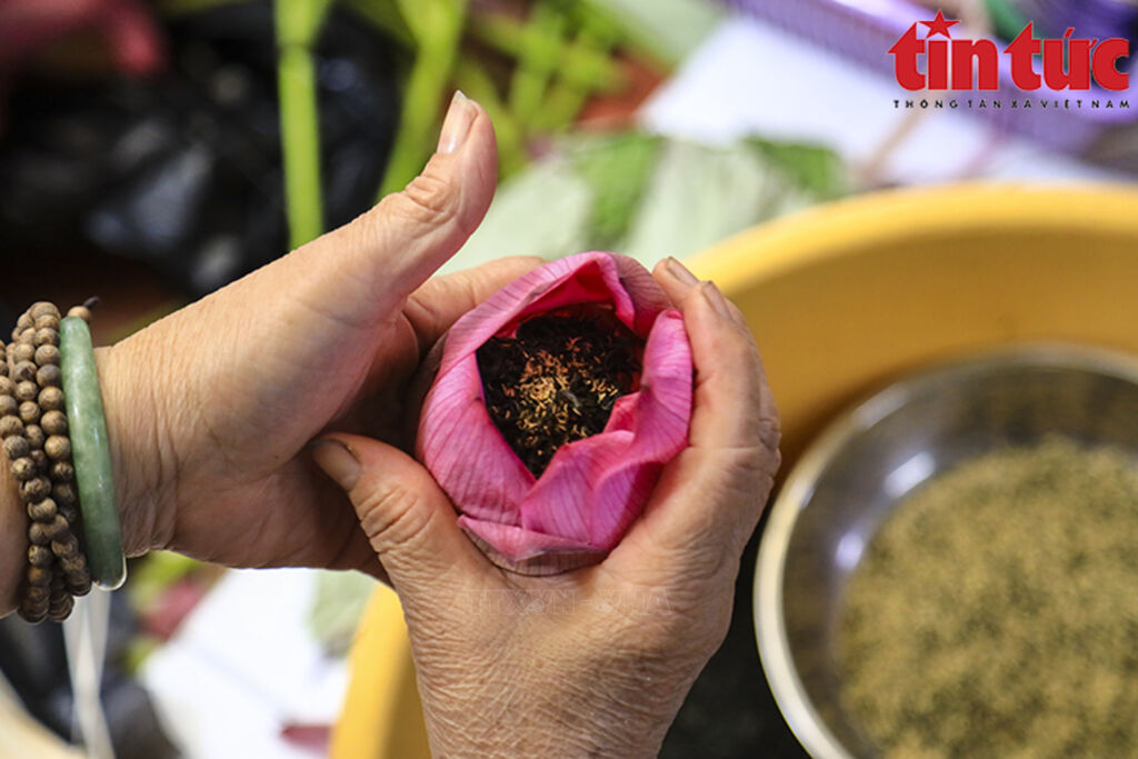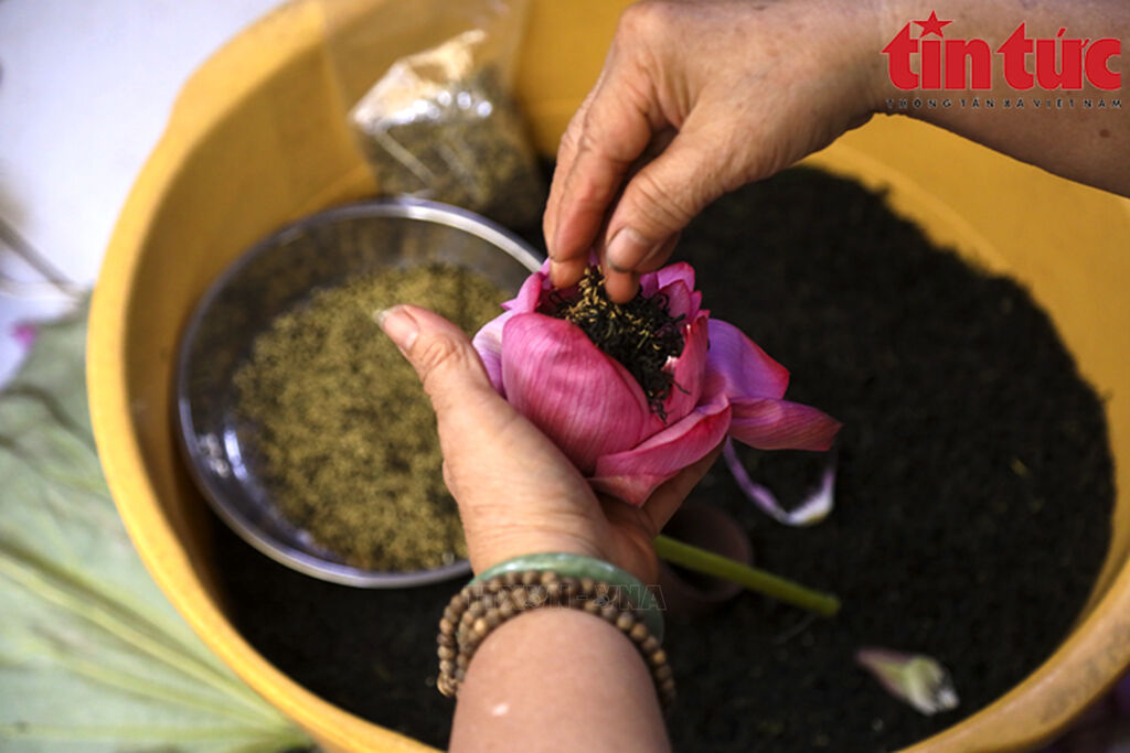 Những bông hoa sen được hái từ sáng sớm, khi còn hơi sương, để đảm bảo độ tươi và giữ được hương thơm của sen.Từ cuối tháng 5 hàng năm sen đã bắt đầu nở, nhưng thời điểm chính vụ và thu hoạch nhiều nhất là giữa tháng 6 và đầu tháng 7.Sen dùng ướp trà là sen Bách Diệp, với nhiều cánh, màu hồng nhạt, chúm chím nụ.Theo những người tâm huyết với nghề làm trà sen lâu năm, để có được loại trà sen thơm ngon nhất, phải qua nhiều công đoạn tỷ mỷ và công phu, từ hái sen cho đến tách gạo sen và ướp trà…Để làm ra một kg trà sen, cần tới 1.000-1.200 bông sen. Mọi công đoạn ướp trà sen đều được làm thủ công hoàn toàn.Từng búp sen Bách Diệp được chọn lựa cẩn thận sau đó cánh hoa, nhụy hoa và gạo sen được tách rời.Cụ Nguyễn Thị Tâm (96 tuổi, quận Tây Hồ) chia sẻ, gia đình có nghề truyền thống ướp trà sen từ lâu đời, đến nay cụ vẫn tiếp tục gắn bó với công việc ướp trà và hướng dẫn các thế hệ con cháu tiếp nối nghề truyền thống của gia đình.Việc tách gạo sen là công đoạn khó nhất, đòi hỏi người làm phải nhanh tay, khéo léo để gạo sen trắng, không nát, giữ được mùi hương.Việc tách gạo sen là công đoạn khó nhất, đòi hỏi người làm phải nhanh tay, khéo léo để gạo sen trắng, không nát, giữ được mùi hương.Trà dùng ướp sen phải là trà Tân Cương (Thái Nguyên) loại ngon.Cách ướp là cứ một lớp gạo sen bên trên, lại một lớp chè bên dưới, rồi đem ủ và sấy trong 3 ngày, làm đi làm lại 7 lần mới được một mẻ trà sen.Bên cạnh phương pháp ướp gạo sen đầy công phu, ướp “xổi” được một số người làm trà lựa chọn với ưu điểm nhanh gọn, dễ làm.Loại trà ngon được lựa chọn, xử lý khô tạo độ hút, sau đó được cho vào hoa sen, buộc lại...Tiếp đó hoa được bảo quản nhằm giữ độ tươi, để trà thẩm thấu hương thơm dịu ngát của sen.Loại trà xổi ướp trong bông sen có giá 35.000-70.000 đồng/bông. Đây cũng được xem là loại trà có giá đắt đỏ bậc nhất.