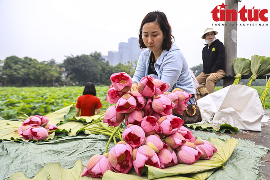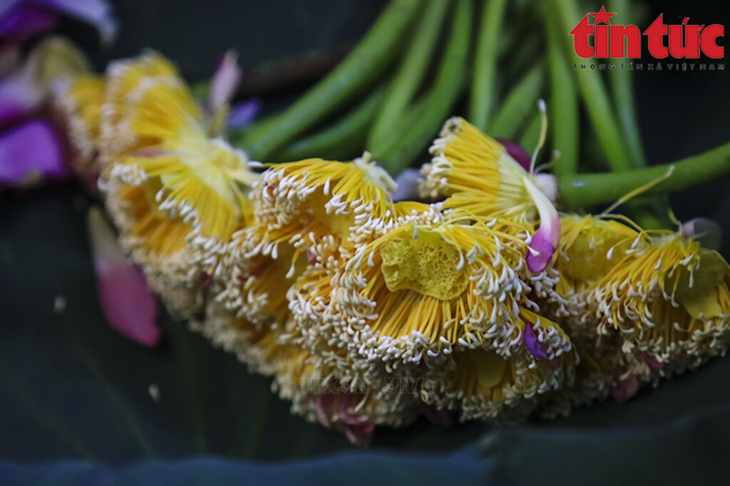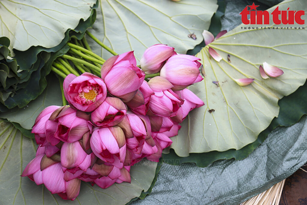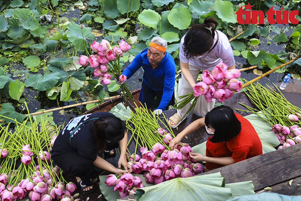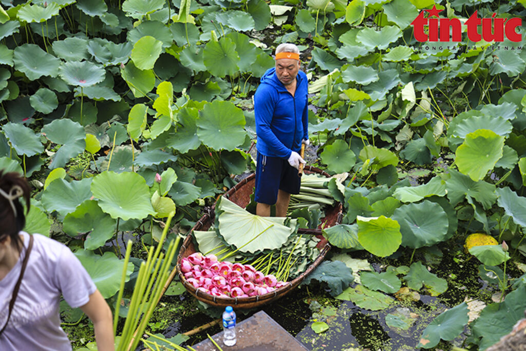 Những bông hoa sen được hái từ sáng sớm, khi còn hơi sương, để đảm bảo độ tươi và giữ được hương thơm của sen.Từ cuối tháng 5 hàng năm sen đã bắt đầu nở, nhưng thời điểm chính vụ và thu hoạch nhiều nhất là giữa tháng 6 và đầu tháng 7.Sen dùng ướp trà là sen Bách Diệp, với nhiều cánh, màu hồng nhạt, chúm chím nụ.Theo những người tâm huyết với nghề làm trà sen lâu năm, để có được loại trà sen thơm ngon nhất, phải qua nhiều công đoạn tỷ mỷ và công phu, từ hái sen cho đến tách gạo sen và ướp trà…Để làm ra một kg trà sen, cần tới 1.000-1.200 bông sen. Mọi công đoạn ướp trà sen đều được làm thủ công hoàn toàn.Từng búp sen Bách Diệp được chọn lựa cẩn thận sau đó cánh hoa, nhụy hoa và gạo sen được tách rời.Cụ Nguyễn Thị Tâm (96 tuổi, quận Tây Hồ) chia sẻ, gia đình có nghề truyền thống ướp trà sen từ lâu đời, đến nay cụ vẫn tiếp tục gắn bó với công việc ướp trà và hướng dẫn các thế hệ con cháu tiếp nối nghề truyền thống của gia đình.Việc tách gạo sen là công đoạn khó nhất, đòi hỏi người làm phải nhanh tay, khéo léo để gạo sen trắng, không nát, giữ được mùi hương.Việc tách gạo sen là công đoạn khó nhất, đòi hỏi người làm phải nhanh tay, khéo léo để gạo sen trắng, không nát, giữ được mùi hương.Trà dùng ướp sen phải là trà Tân Cương (Thái Nguyên) loại ngon.Cách ướp là cứ một lớp gạo sen bên trên, lại một lớp chè bên dưới, rồi đem ủ và sấy trong 3 ngày, làm đi làm lại 7 lần mới được một mẻ trà sen.Bên cạnh phương pháp ướp gạo sen đầy công phu, ướp “xổi” được một số người làm trà lựa chọn với ưu điểm nhanh gọn, dễ làm.Loại trà ngon được lựa chọn, xử lý khô tạo độ hút, sau đó được cho vào hoa sen, buộc lại...Tiếp đó hoa được bảo quản nhằm giữ độ tươi, để trà thẩm thấu hương thơm dịu ngát của sen.Loại trà xổi ướp trong bông sen có giá 35.000-70.000 đồng/bông. Đây cũng được xem là loại trà có giá đắt đỏ bậc nhất.