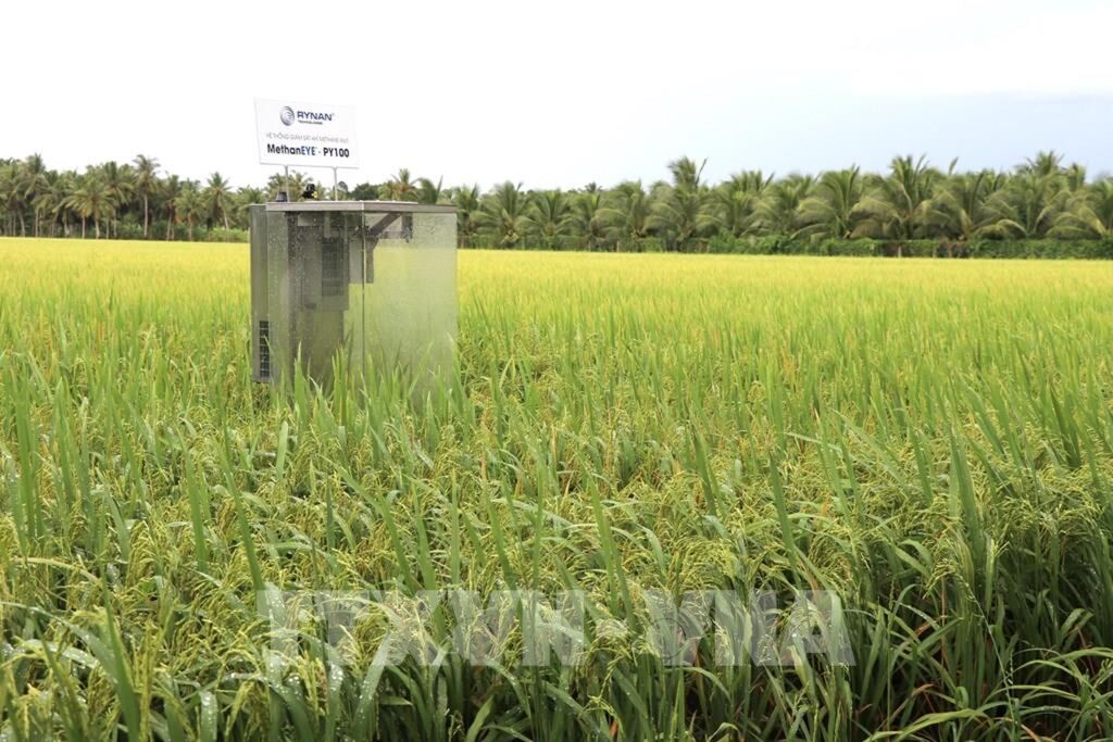 | Ruộng lúa trong mô hình lúa chất lượng cao, phát thải thấp của hợp tác xã nông nghiệp Phước Hảo, xã Hưng Mỹ được lắp đặt hệ thống giám sát khí methane quản lý bằng điện thoại thông minh. |