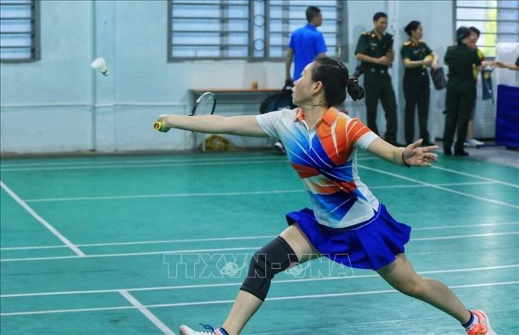 | Các vận động viên Quân khu 7 thi đấu cầu lông đôi nữ. |
