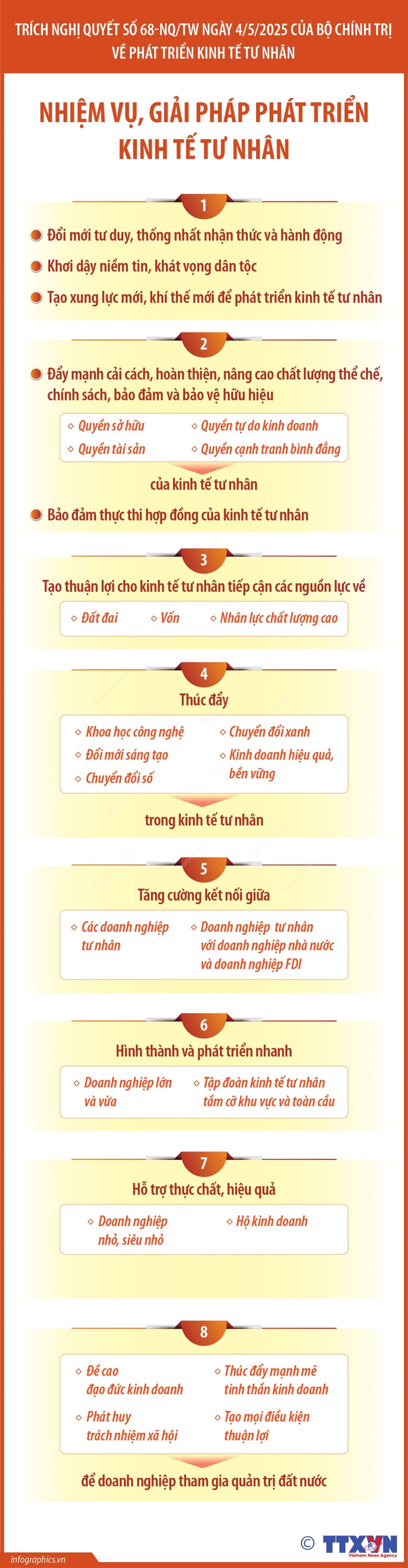 Thay mặt Bộ Chính trị, Tổng Bí thư Tô Lâm vừa ký Nghị quyết số 68-NQ/TW ngày 4/5/2025 của Bộ Chính trị về phát triển kinh tế tư nhân. Nghị quyết đề ra các nhiệm vụ, giải pháp phát triển kinh tế tư nhân: Đổi mới tư duy, thống nhất nhận thức và hành động, khởi dậy niềm tin, khát vọng dân tộc, tạo xung lực mới, khí thế mới để phát triển kinh tế tư nhân, cải cách thể chế, bảo vệ quyền tài sản và tự do kinh doanh, tạo thuận lợi cho kinh tế tư nhân tiếp cận nguồn lực (đất đai, vốn, nhân lực), thúc đẩy khoa học, công nghệ, đổi mới sáng tạo, chuyển đổi số, chuyển đổi xanh….