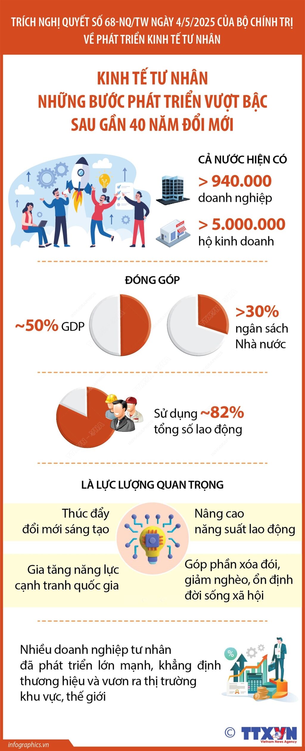 Thay mặt Bộ Chính trị, Tổng Bí thư Tô Lâm vừa ký Nghị quyết số 68-NQ/TW ngày 4/5/2025 của Bộ Chính trị về phát triển kinh tế tư nhân. Nghị quyết nêu rõ, sau gần 40 năm đổi mới, kinh tế tư nhân nước ta đã từng bước phát triển cả về số lượng và chất lượng, trở thành một trong những động lực quan trọng của nền kinh tế thị trường định hướng xã hội chủ nghĩa. Khu vực kinh tế tư nhân hiện có khoảng hơn 940 nghìn doanh nghiệp và hơn 5 triệu hộ kinh doanh đang hoạt động, đóng góp khoảng 50% GDP, hơn 30% tổng thu ngân sách nhà nước và sử dụng khoảng 82% tổng số lao động vào tăng trưởng kinh tế, tạo việc làm, là lực lượng quan trọng thúc đẩy đổi mới sáng tạo, nâng cao năng suất lạo động, gia tăng năng lực cạnh tranh quốc gia, góp phần xóa đói, giảm nghèo, ổn định đời sống xã hội. Nhiều doanh nghiệp tư nhân đã phát triển lớn mạnh, khẳng định thương hiệu và vươn ra thị trường khu vực, thế giới.