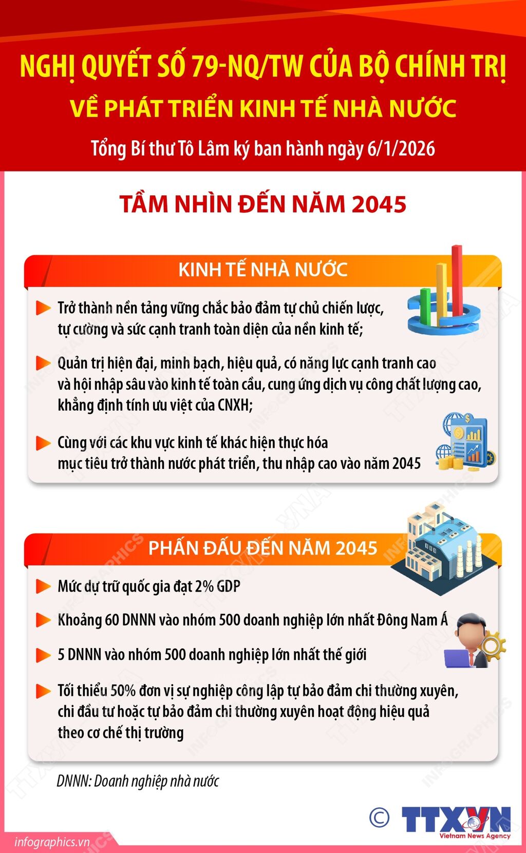 Thay mặt Bộ Chính trị, Tổng Bí thư Tô Lâm ký ban hành Nghị quyết số 79-NQ/TW ngày 6/1/2026 của Bộ Chính trị "về phát triển kinh tế nhà nước. Nghị quyết đề ra mục tiêu tổng quát: Nâng cao hiệu quả, phát huy vai trò chủ đạo, tiên phong, định hướng chiến lược của kinh tế nhà nước trong những ngành, lĩnh vực then chốt, thiết yếu, chiến lược; dẫn dắt, hỗ trợ các thành phần kinh tế khác cùng phát triển; góp phần thúc đẩy phát triển nhanh, bền vững, bảo đảm quốc phòng, an ninh quốc gia; thúc đẩy tiến bộ, công bằng xã hội, nâng cao đời sống người dân; góp phần thực hiện thắng lợi mục tiêu đến năm 2030 trở thành nước đang phát triển có công nghiệp hiện đại, thu nhập trung bình cao; hiện thực hóa tầm nhìn đến năm 2045 trở thành nước phát triển, thu nhập cao. Ngoài mục tiêu tổng quát, nghị quyết đề ra các mục tiêu cụ thể đến năm 2030 và tầm nhìn đến năm 2045.