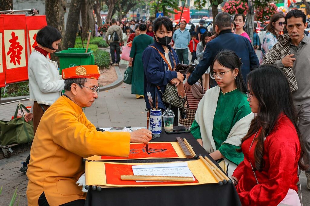 Chiều 19/2/2026, (mùng 3 Tết Bính Ngọ), dòng người đổ về các tuyến phố quanh hồ Hoàn Kiếm ngày càng đông, tạo nên không khí Xuân rộn ràng giữa tiết trời mát mẻ, dễ chịu. Đông đảo du khách trong và ngoài nước cũng hòa mình vào nhịp vui chung, tận hưởng trọn vẹn không gian văn hóa đặc sắc của Hà Nội những ngày đầu năm. Nhiều gia đình, nhóm bạn trẻ diện trang phục tươi tắn, cùng nhau dạo quanh hồ, tham quan đền Ngọc Sơn, xin chữ đầu năm và lưu lại những bức ảnh kỷ niệm bên những loài đua sắc rực rỡ, góp phần tạo nên bức tranh đầu Xuân tươi mới. Ảnh: Hoàng Hiếu - TTXVN