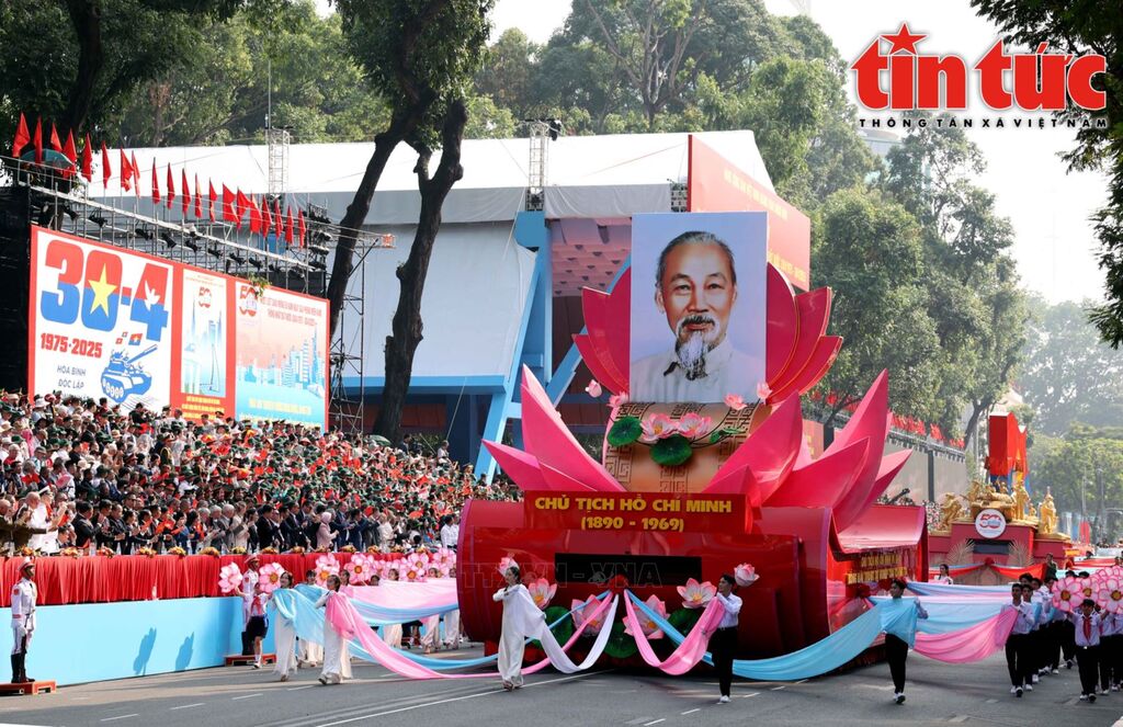 | Xe mang ảnh Chủ tịch Hồ Chí Minh tại lễ kỷ niệm 50 năm ngày Giải phóng miền Nam, thống nhất đất nước. Ảnh: An Hiếu/Báo Tin tức và Dân tộc |