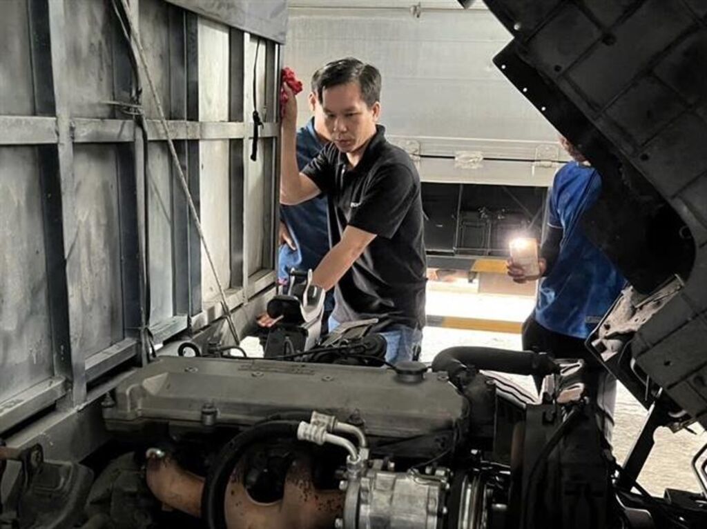 | Anh Hồ Phan Phước Sanh trong một buổi làm việc tại xưởng dịch vụ Ôtô Isuzu An Lạc. |