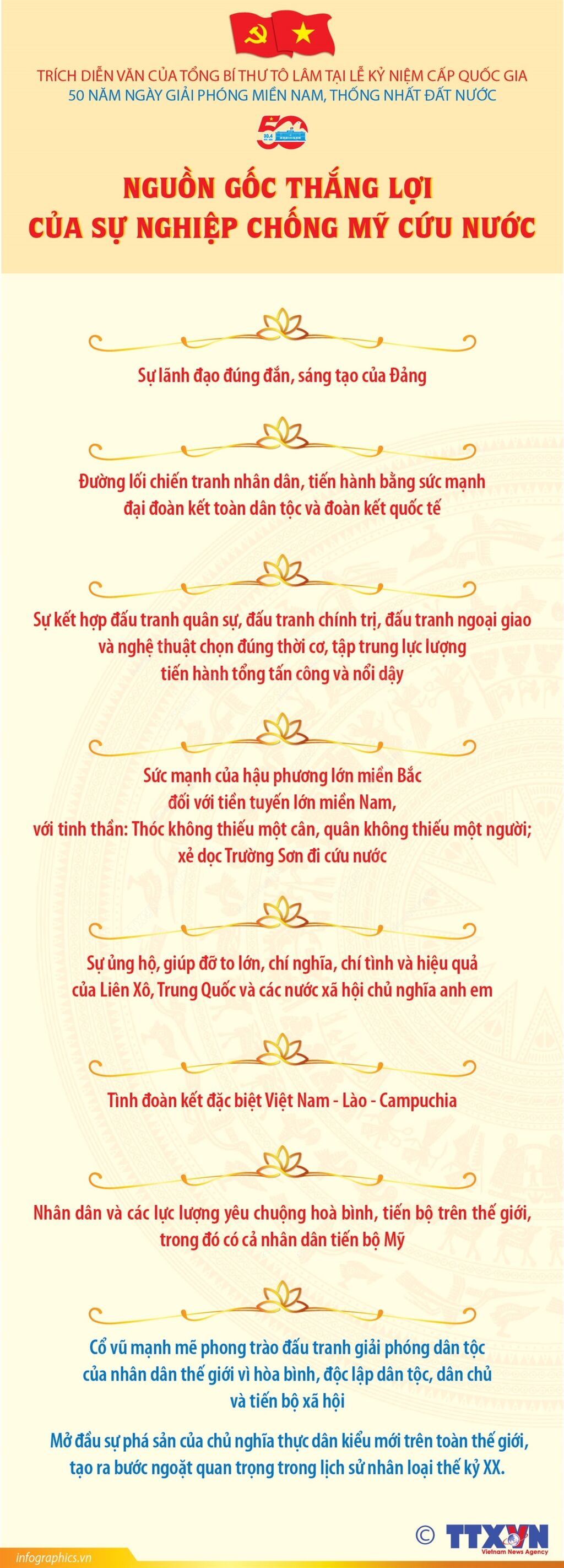 Trong bài diễn văn tại Lễ kỷ niệm cấp quốc gia 50 năm Ngày Giải phóng miền Nam, thống nhất đất nước ngay 30/4/2025, Tổng Bí thư Tô Lâm khẳng định: Thắng lợi của sự nghiệp kháng chiến chống Mỹ cứu nước bắt nguồn từ sự lãnh đạo đúng đắn, sáng tạo của Đảng; từ đường lối chiến tranh nhân dân, tiến hành bằng sức mạnh đại đoàn kết toàn dân tộc và đoàn kết quốc tế; từ sự kết hợp đấu tranh quân sự, đấu tranh chính trị, đấu tranh ngoại giao và nghệ thuật chọn đúng thời cơ, tập trung lực lượng tiến hành tổng tấn công và nổi dậy; từ sức mạnh của hậu phương lớn miền Bắc đối với tiền tuyến lớn miền Nam, với tinh thần: Thóc không thiếu một cân, quân không thiếu một người; xẻ dọc Trường Sơn đi cứu nước; từ sự ủng hộ, giúp đỡ to lớn, chí nghĩa, chí tình và hiệu quả của Liên Xô, Trung Quốc và các nước xã hội chủ nghĩa anh em; của tình đoàn kết đặc biệt Việt Nam - Lào - Campuchia; của nhân dân và các lực lượng yêu chuộng hòa bình, tiến bộ trên thế giới, trong đó có cả nhân dân tiến bộ Mỹ. Đặc biệt, Đại thắng mùa Xuân năm 1975 đã cổ vũ mạnh mẽ phong trào đấu tranh giải phóng dân tộc của nhân dân thế giới vì hòa bình, độc lập dân tộc, dân chủ và tiến bộ xã hội; mở đầu sự phá sản của chủ nghĩa thực dân kiểu mới trên toàn thế giới, tạo ra bước ngoặt quan trọng trong lịch sử nhân loại thế kỷ XX.