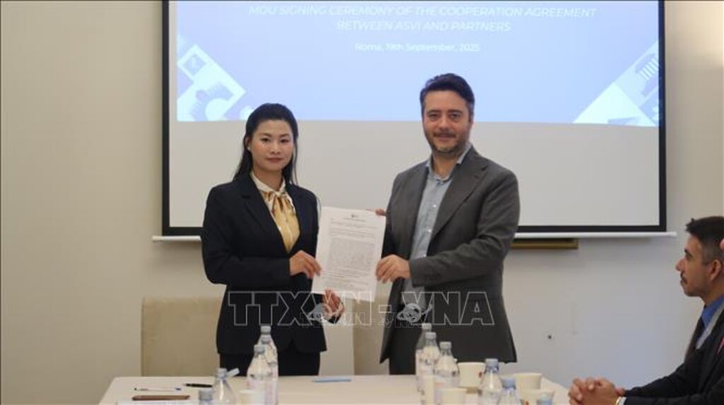 | Chị Nguyễn Thị Bích Diệp của ASVI và Francesco Maringiò của Fondazione Italy–Vietnam ký thỏa thuận hợp tác. Ảnh: Trường Dụy- PV TTXVN tại Rome |