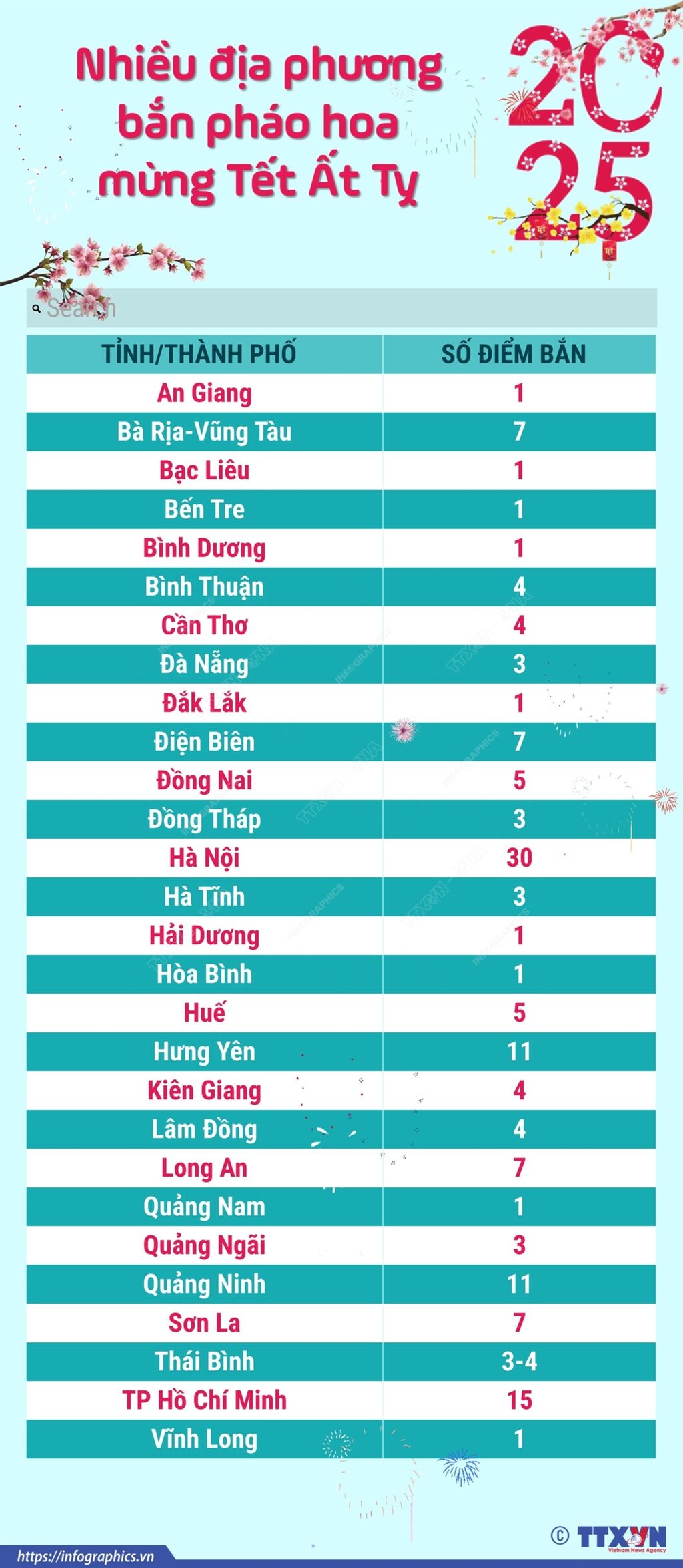 Vào thời khắc giao thừa năm mới Ất Tỵ 2025, Thành phố Hồ Chí Minh sẽ tổ chức bắn pháo hoa tầm cao tại khu vực đầu đường hầm sông Sài Gòn (phường Thủ Thiêm, TP Thủ Đức) và khu Đền Tưởng niệm Liệt sĩ Bến Dược (xã Phú Mỹ Hưng, huyện Củ Chi). Ngoài ra, pháo hoa tầm thấp sẽ được bắn tại 13 địa điểm khác của thành phố.