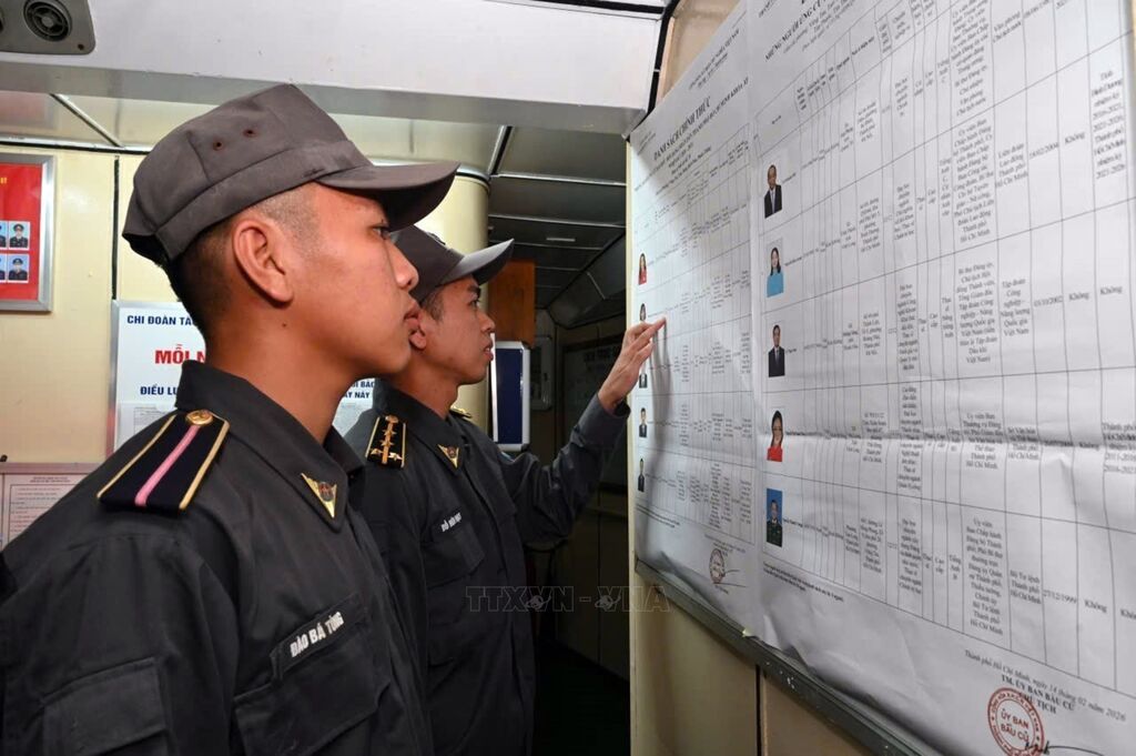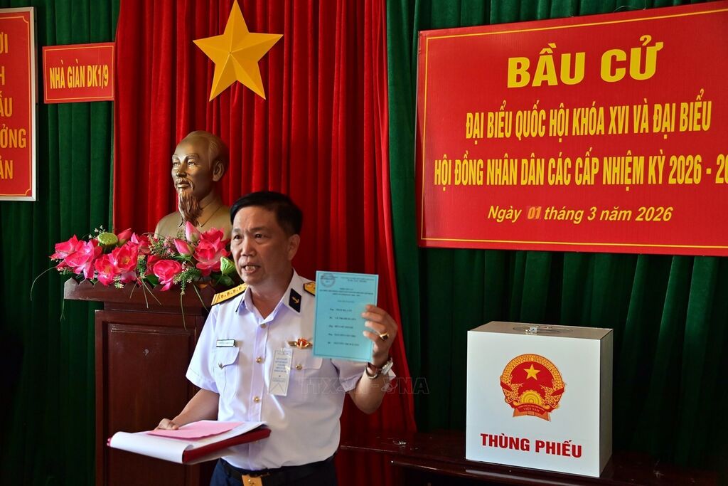 Sáng 1/3/2026, Tổ bầu cử sớm của Vùng 2 Hải quân có mặt tại Cụm Ba Kè để tổ chức bỏ phiếu sớm cho các cử tri trên tàu Hải An 68 và Nhà giàn DK1/9. Trước đó, trên chuyến hải trình tới Cụm Ba Kè, ngày 27/2, Tổ bầu cử đã tổ chức để các cử tri trên 4 tàu của Hải đoàn 128, Hải đoàn 129 thuộc Quân chủng Hải quân đang thực hiện nhiệm vụ tại khu vực mỏ Bạch Hổ bỏ phiếu bầu. Chiều 28/2, Tổ bầu cử sớm trên biển đi trên tàu Kiểm ngư 260 cho biết, từ ngày 26/2 đến 28/2 cũng đã tổ chức để cử tri trên 3 tàu trực, tuần tra trên biển bỏ phiếu sớm. Ảnh: TTXVN phát