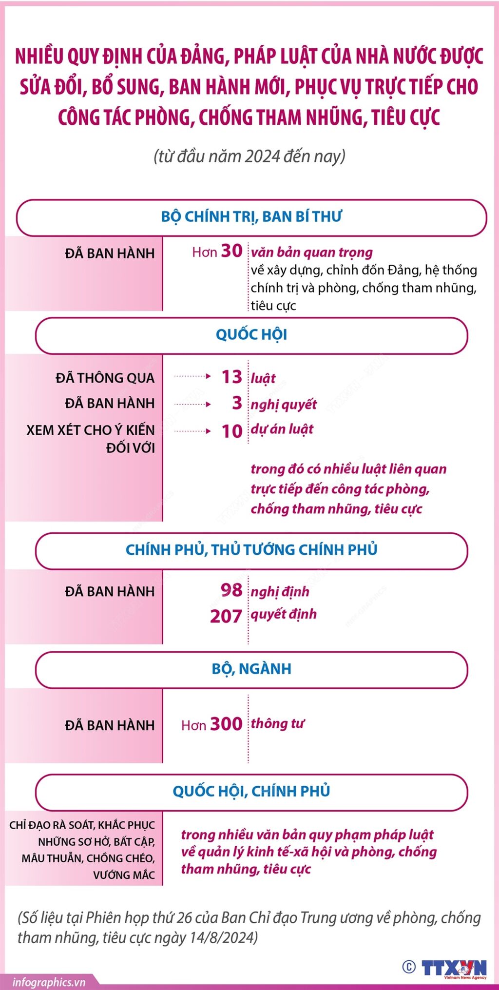 Từ đầu năm 2024 đến nay, nhiều quy định của Đảng, pháp luật của Nhà nước được sửa đổi, bổ sung, ban hành mới, phục vụ trực tiếp cho công tác phòng, chống tham nhũng, tiêu cực. Bộ Chính trị, Ban Bí thư đã ban hành hơn 30 văn bản quan trọng về xây dựng, chỉnh đốn Đảng, hệ thống chính trị và phòng, chống tham nhũng, tiêu cực. Quốc hội đã thông qua 13 luật, ban hành 3 nghị quyết, xem xét cho ý kiến đối với 10 dự án luật, trong đó có nhiều luật liên quan trực tiếp đến công tác phòng, chống tham nhũng, tiêu cực. Chính phủ, Thủ tướng Chính phủ ban hành 98 nghị định, 207 quyết định; các bộ, ngành ban hành hơn 300 thông tư...