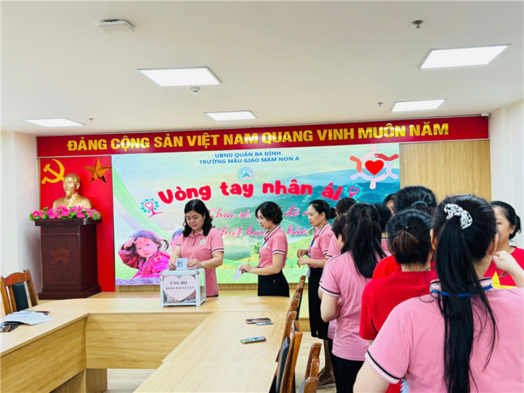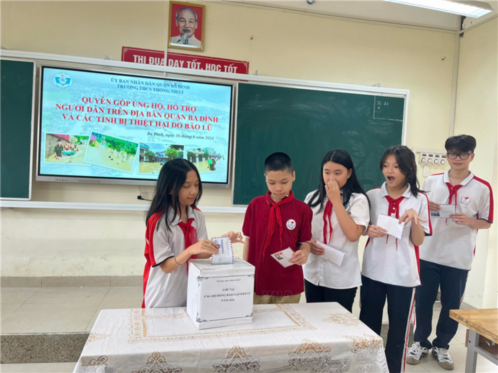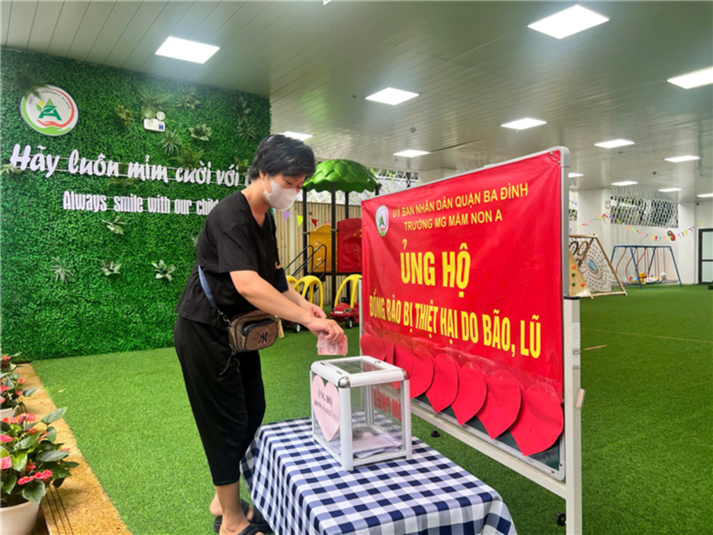Cán bộ, giáo viên Trường Mẫu giáo Mầm Non A (quận Ba Đình) ủng hộ đồng bào vùng lũ.Phụ huynh Trường Mẫu giáo Mầm Non A (quận Ba Đình) tham gia quyên góp.Trường Tiểu học Trung Yên gửi yêu thương tới học sinh vùng lũ.Học sinh Trường THCS Thống Nhất quyên góp ủng hộ tại lớp.Học sinh Trường Tiểu học Hà Nội (quận Ba Đình) học làm muối vùng gửi các bạn học sinh vùng lũ.