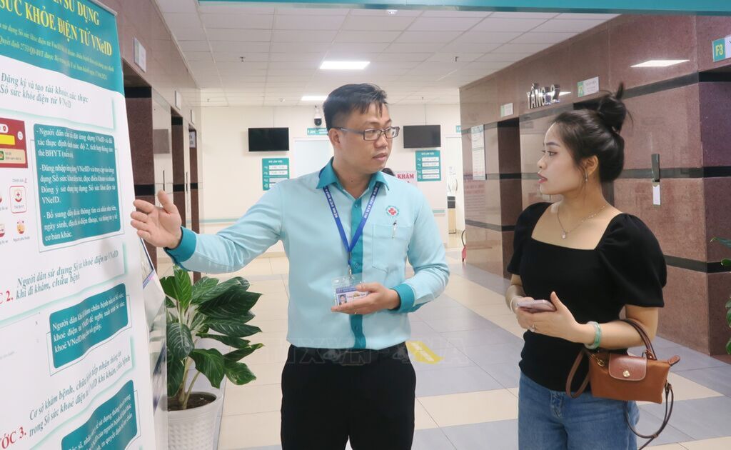 | Nhân viên y tế Bệnh viện Nhân dân 115 Thành phố Hồ Chí Minh hướng dẫn người bệnh tích hợp Sổ sức khỏe điện tử trên ứng dụng VNeID. |