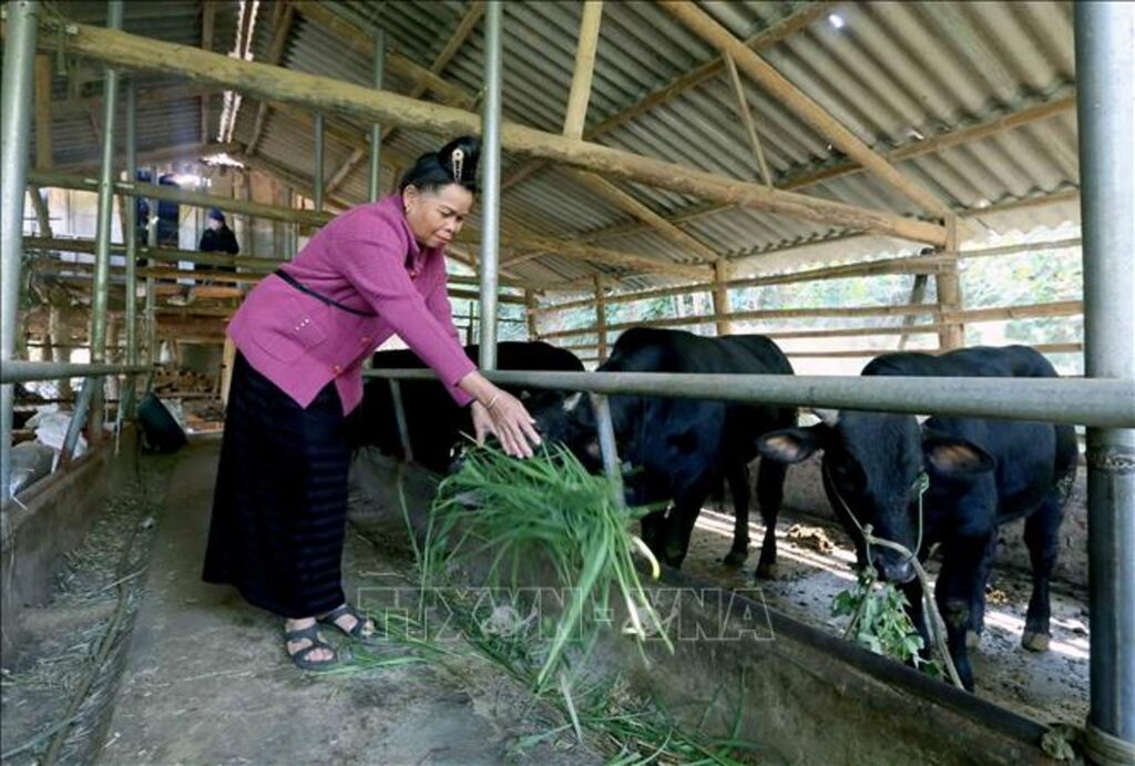 | Bà Cà Thị Móng tại bản Pảng, xã Chiềng Đen, thành phố Sơn La chăm sóc đàn bò của gia đình. |