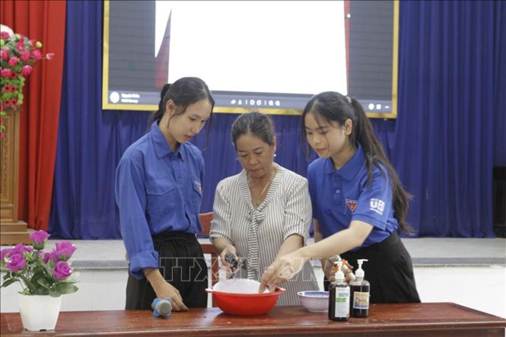 | Các bạn sinh viên hướng dẫn cách làm dung dịch tẩy rửa đa năng từ rác hữu cơ cho người dân xã Điện Phong, thị xã Điện Bàn, tỉnh Quảng Nam. |