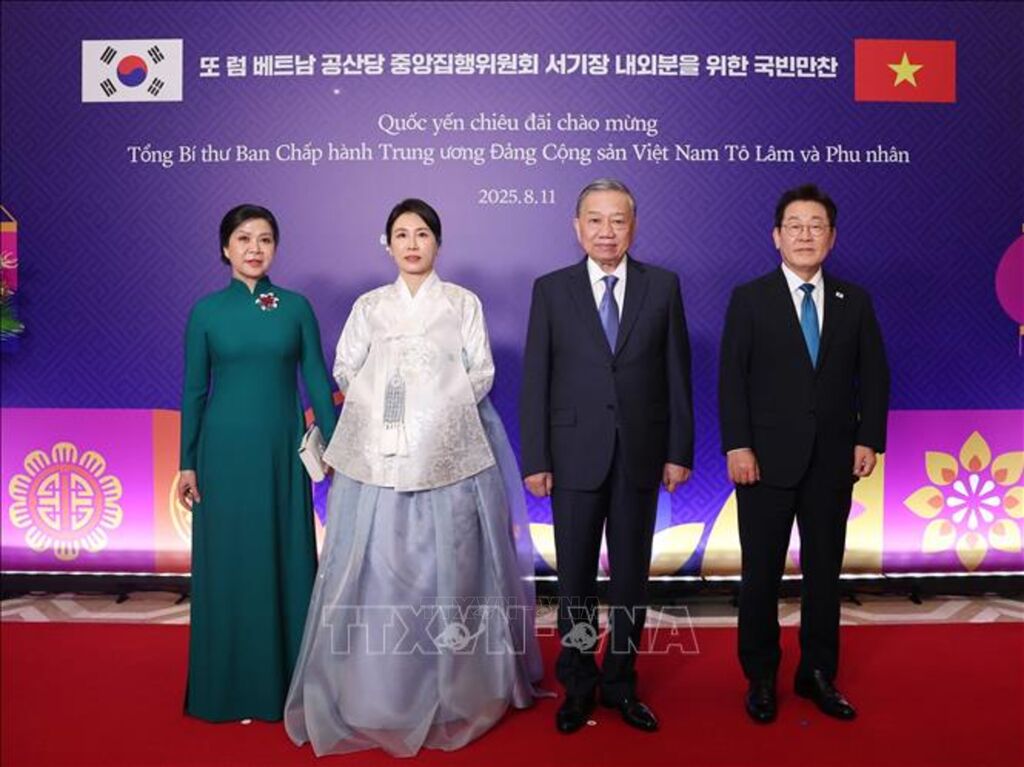 | Tổng thống Hàn Quốc Lee Jae Myung và Phu nhân chủ trì Quốc yến chiêu đãi chào mừng Tổng Bí thư Tô Lâm và Phu nhân thăm cấp Nhà nước tới Hàn Quốc. Ảnh: Thống Nhất – TTXVN |
