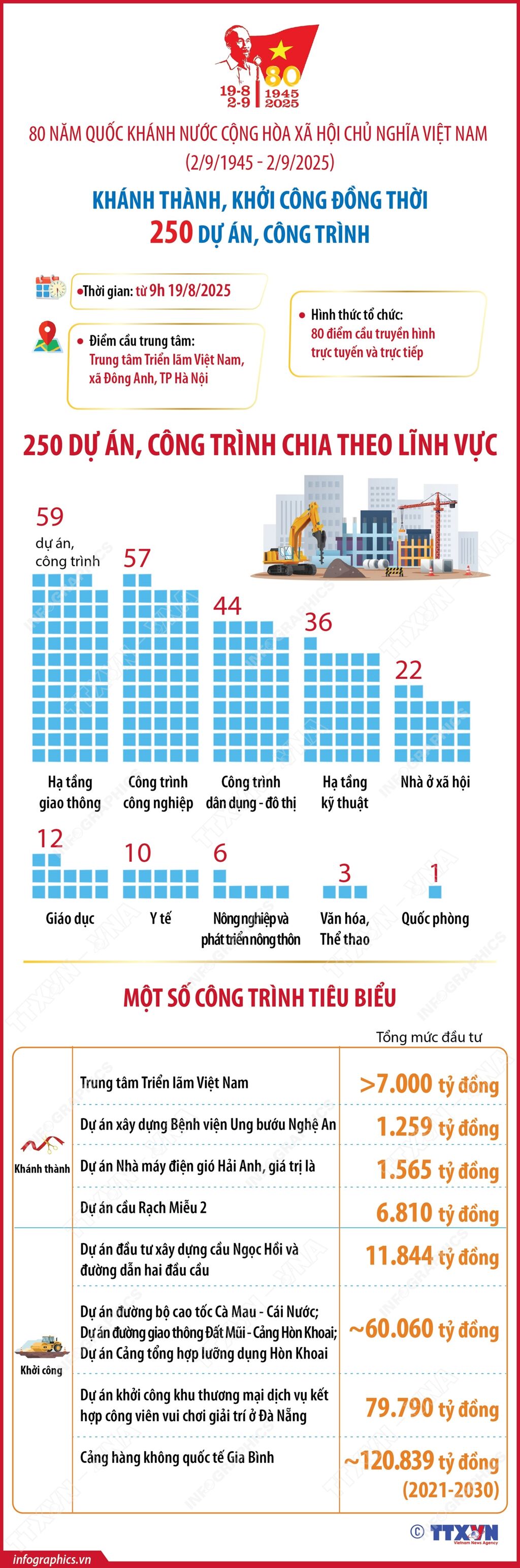 Lần này, với việc khởi công, khánh thành đồng loạt 250 dự án đúng dịp kỷ niệm 80 năm Cách mạng Tháng Tám và Quốc khánh 2/9 cũng tạo ra những công trình mang tầm vóc lịch sử, hiện thực hóa các chủ trương của Đảng và Nhà nước trong phát triển hạ tầng chiến lược toàn diện, tạo nền tảng và không gian phát triển mới về kinh tế - xã hội, bảo vệ an ninh - quốc phòng; là động lực quan trọng thúc đẩy tăng trưởng, phát triển đất nước trong giai đoạn mới. Đồng thời, đây cũng là bước đột phá về kết nối kinh tế, liên kết vùng, liên kết quốc gia, liên kết quốc tế; kết nối rộng khắp, đồng bộ, toàn diện, nâng cao hiệu quả khai thác hạ tầng, thúc đẩy phát triển kinh tế, tạo ra giá trị gia tăng của đất, rừng, sông, nước..., góp phần nâng cao đời sống tinh thần, vật chất của người dân các vùng có dự án, nâng cao năng lực cạnh tranh quốc gia. Các công trình, dự án được khởi công cũng sẽ góp phần hiện thực hóa mục tiêu phát triển, tăng trưởng kinh tế với tốc độ 2 con số theo định hướng, chỉ đạo của Bộ Chính trị, Ban Bí thư, Chính phủ, Thủ tướng Chính phủ.