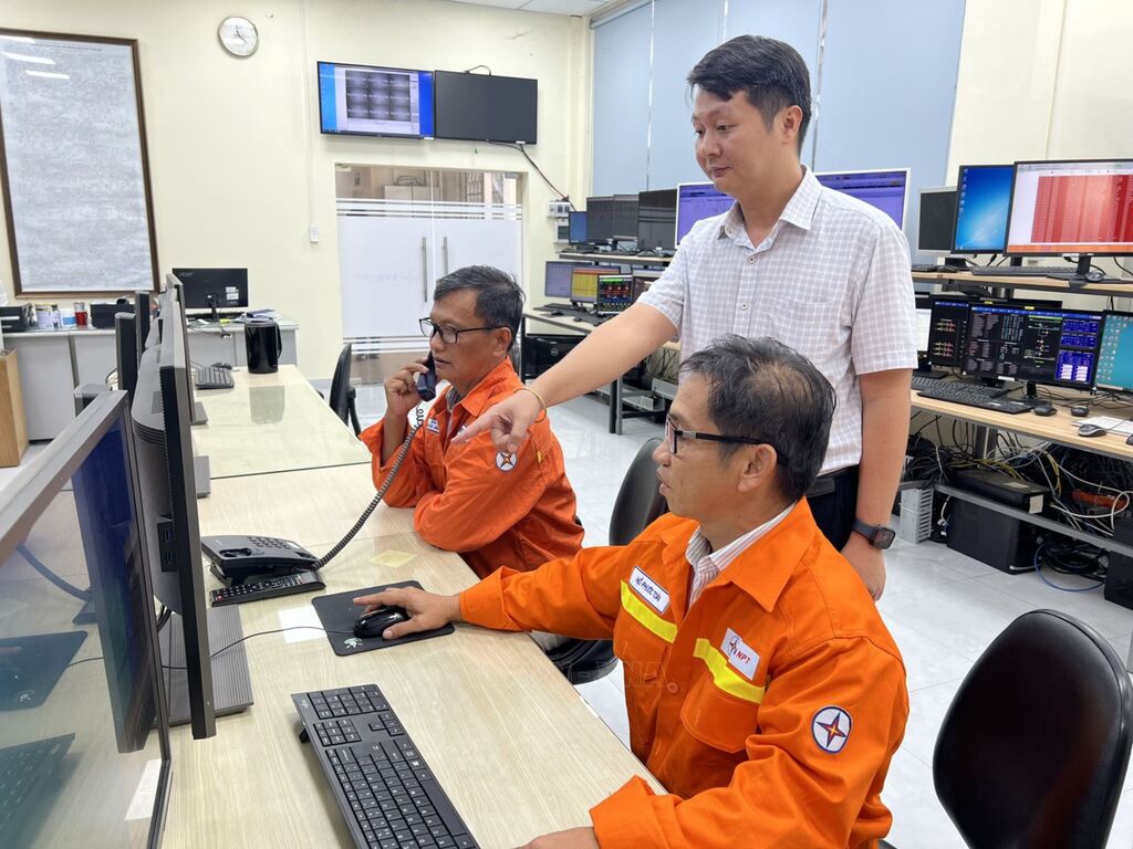| Ông Nguyễn Sỹ Danh (đứng), Phó trưởng Phòng Kỹ thuật, Công ty Truyền tải điện 4 trao đổi công việc với đồng nghiệp. |