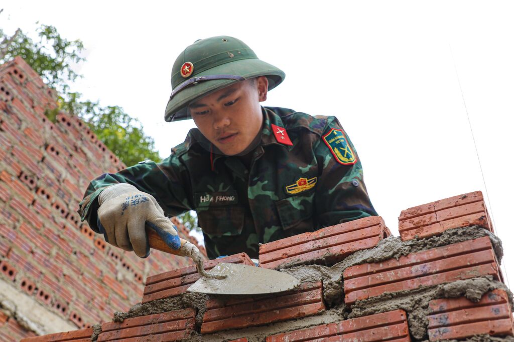 | Chiến sĩ Hờ A Phong, Trung đoàn 741 giúp người dân xây nhà tại Bản Tin Tốc 1, xã Mường Pồn, huyện Điện Biên. |