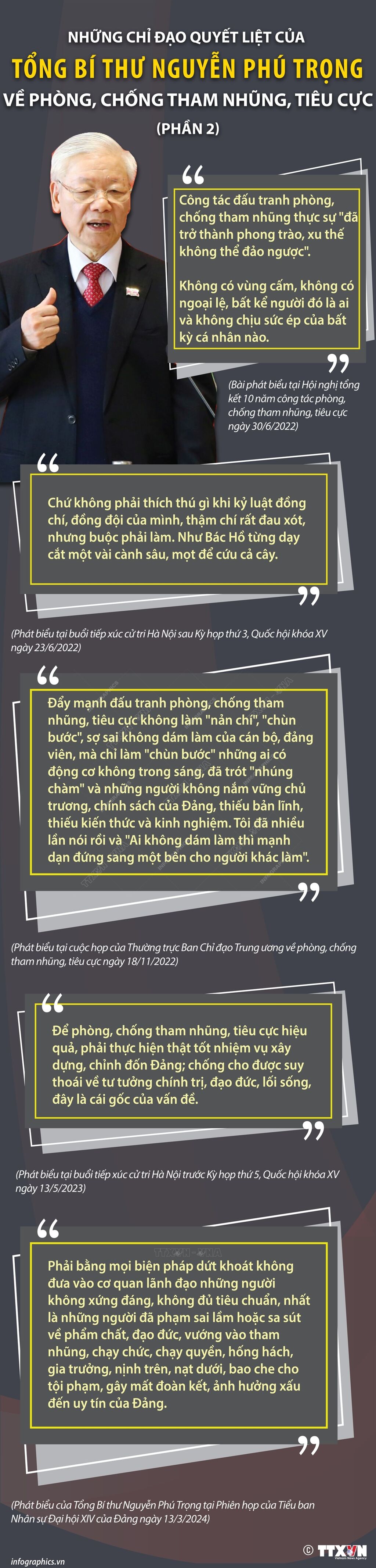 Trong suốt cuộc đời cống hiến cho sự nghiệp cách mạng của Đảng và dân tộc, Tổng Bí thư Nguyễn Phú Trọng đã có những phát biểu, ý kiến tâm huyết, sâu sắc nhằm xây dựng Đảng trong sạch, vững mạnh và quyết liệt đấu tranh phòng, chống tham nhũng, tiêu cực. Là Trưởng Ban Chỉ đạo Trung ương về phòng, chống tham nhũng, tiêu cực, với quyết tâm chính trị rất cao, Tổng Bí thư Nguyễn Phú Trọng đã chỉ đạo quyết liệt, kiên trì, đồng bộ, toàn diện, bài bản, đi vào chiều sâu, có bước đột phá, gắn liền giữa phòng, chống tham nhũng, tiêu cực với xây dựng, chỉnh đốn Đảng và hệ thống chính trị.