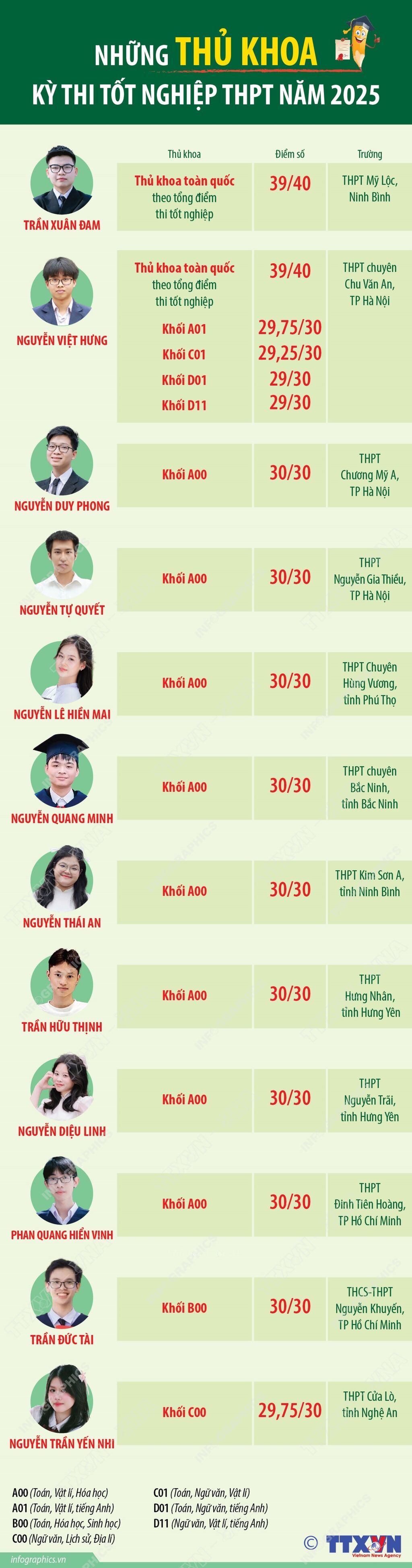 Trong kỳ thi tốt nghiệp THPT 2025, Hà Nội có 3 thủ khoa. Trong đó có, 2 thủ khoa khối A00 với số điểm tuyệt đối 30/30 là em Nguyễn Duy Phong (lớp 12A5 Trường THPT Chương Mỹ A) và em Nguyễn Tự Quyết (lớp 12A9 Trường THPT Nguyễn Gia Thiều). Ở khối A1 và khối D00, em Nguyễn Việt Hưng (lớp 12 Anh Trường THPT chuyên Chu Văn An) là thủ khoa với số điểm lần lượt là 29,75 và 29 điểm.