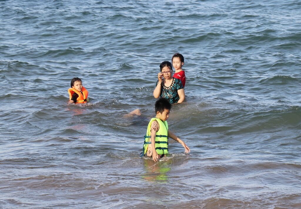 | Để đảm bảo an toàn, trẻ em tắm biển tại bãi biển Bình Sơn (thành phố Phan Rang – Tháp Chàm, tỉnh Ninh Thuận) phải mặc áo phao và có người lớn giám sát. |