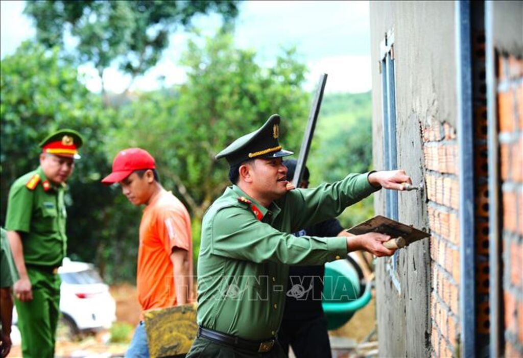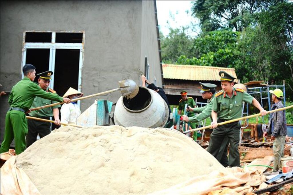| Lực lượng Công an xã Quảng Trực hỗ trợ ngày công để sớm hoàn thiện 10 căn nhà trong đợt 2 của chương trình xóa nhà tạm, nhà dột nát do Công an tỉnh Lâm Đồng triển khai thực hiện. |