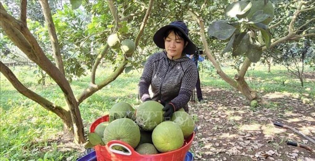 | Nông dân Hợp tác xã bưởi da xanh Sông Xoài thu hoạch bán vào Rằm tháng Giêng vừa qua. Ảnh: Hoàng Nhị - TTXVNNông |