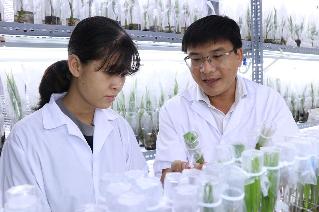 Trường Đại học Trà Vinh, tỉnh Vĩnh Long đã nghiên cứu thành công kỹ thuật nhân giống dừa sáp bằng phương pháp cấy phôi, tăng năng suất nhiều lần so với giống dừa truyền thống. Đây là minh chứng sống động cho tinh thần Nghị quyết 57-NQ/TW của Trung ương, thúc đẩy ứng dụng khoa học – công nghệ vào thực tiễn, giúp nông dân Đồng bằng sông Cửu Long nâng cao hiệu quả sản xuất. Ảnh: Thanh Hòa- TTXVN