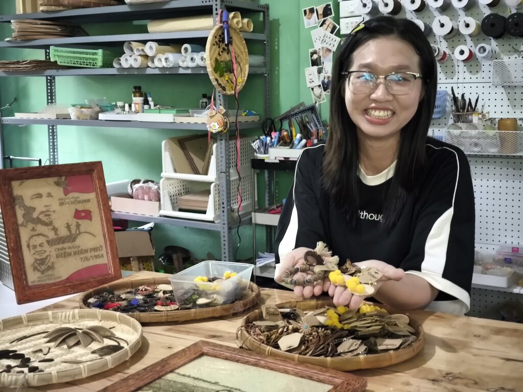| Nguyễn Băng Nhi bên các sản phảm làm từ gáo dừa. |