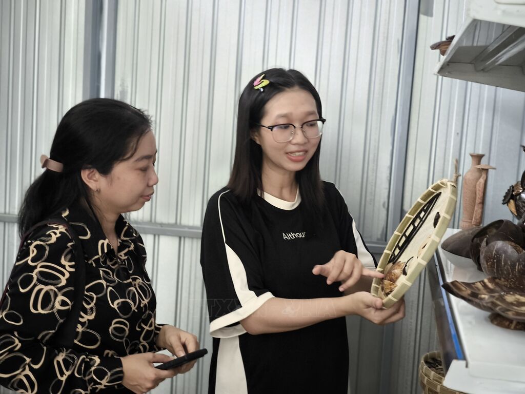 | Băng Nhi giới thiệu cho khách hàng về các sản phẩm từ gáo dừa. |