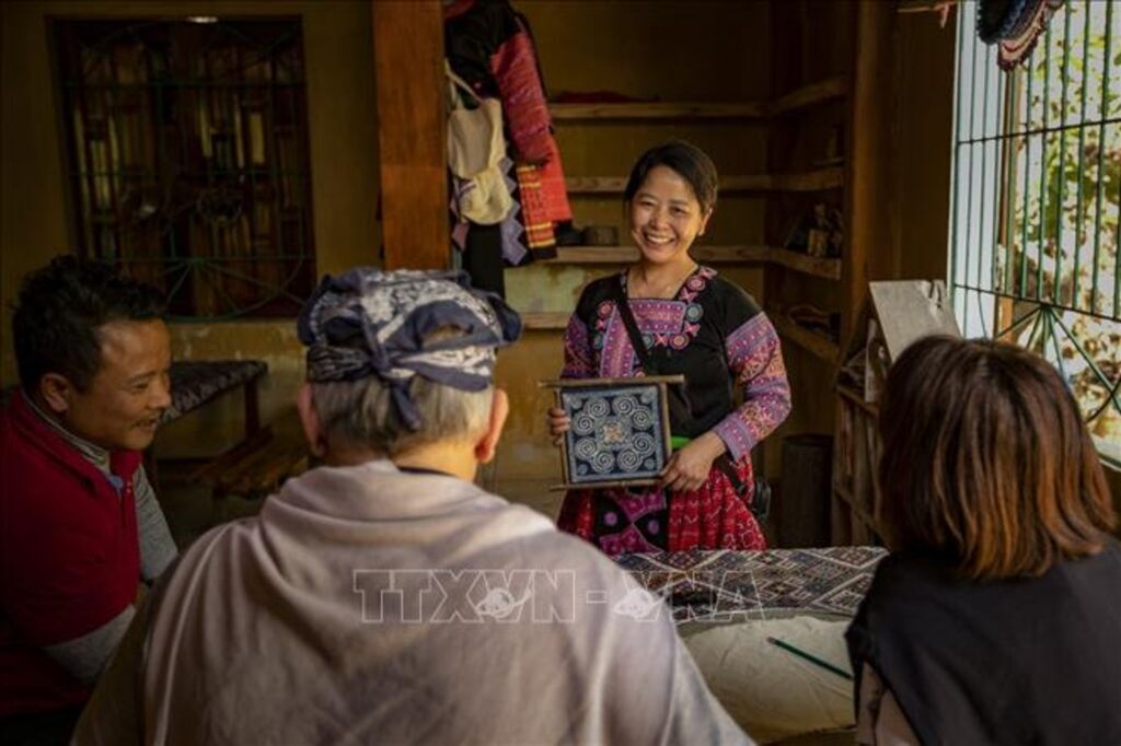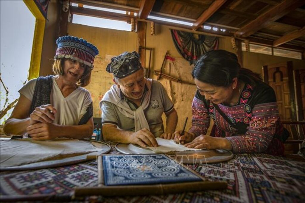 | Chị Sùng Y Mua hướng dẫn du khách Pháp trải nghiệm vẽ sáp ong lên vải thổ cẩm của người Mông tại Homestay. |