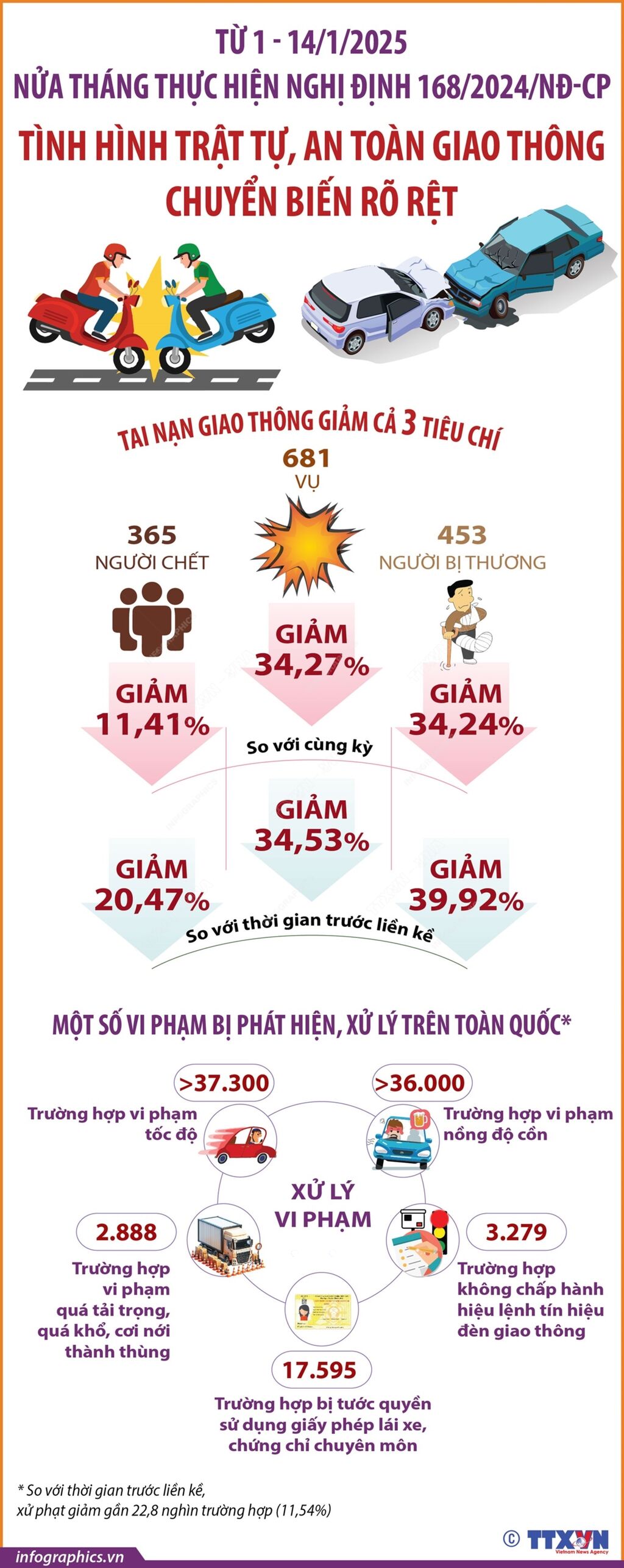 Thông tin từ Cục Cảnh sát giao thông tối 14/1/2025 cho biết, sau nửa tháng thực hiện Nghị định số 168/2024/NĐ-CP của Chính phủ (quy định xử phạt vi phạm hành chính về trật tự, an toàn giao thông trong lĩnh vực giao thông đường bộ; trừ điểm, phục hồi điểm giấy phép lái xe), tình hình trật tự, an toàn giao thông đã có nhiều chuyển biến rõ rệt. Tai nạn giao thông giảm cả 3 tiêu chí, giao thông đi vào nền nếp. Theo đại diện Cục Cảnh sát giao thông, Nghị định 168/2024/NĐ-CP của Chính phủ ban hành với nhiều hành vi tăng nặng mức xử phạt đã tác động sâu sắc đến nhận thức, nâng cao đáng kể ý thức của người tham gia giao thông.