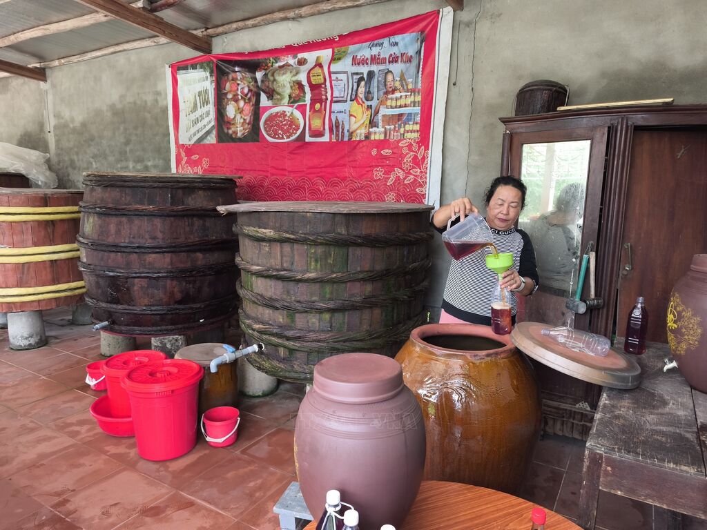 | Chị Trương Thị Bốn (Chủ cơ sở Nước mắm Cửa Khe Bốn Thái) cho biết mắm phải ủ trên 12 tháng thì mới đậm vị, thơm ngon. |