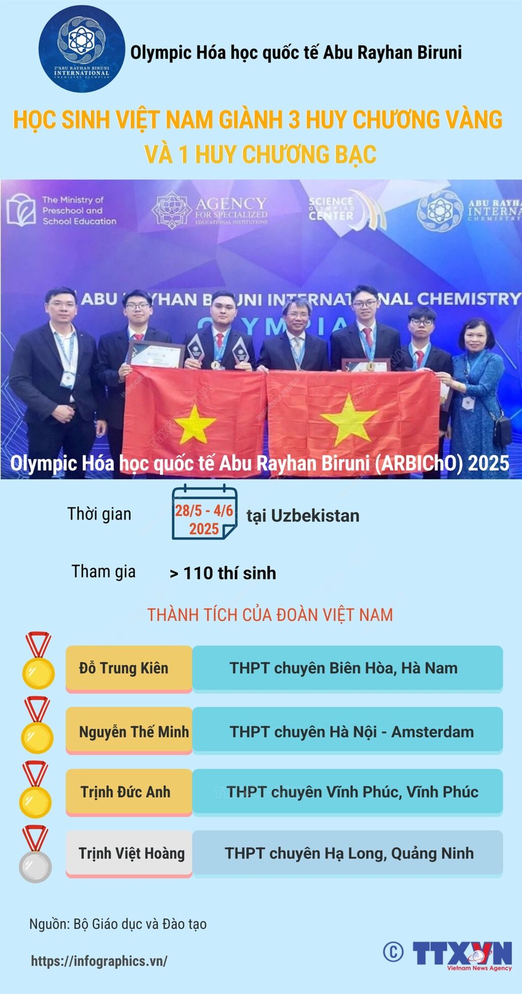 Tại cuộc thi Olympic Hóa học quốc tế Abu Rayhan Biruni (ARBIChO) 2025, diễn ra từ ngày 28/5 đến 4/6/2025, tại Uzbekistan, cả bốn học sinh của đoàn Việt Nam đều đoạt giải. Trong đó, ba học sinh giành Huy chương Vàng và một học sinh giành Huy chương Bạc.