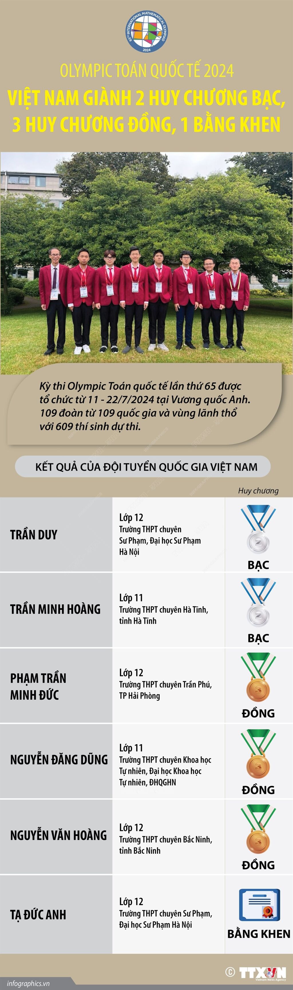 Ngày 20/7/2024, Bộ Giáo dục Đào tạo (GDĐT) nhận được thông tin về kết quả chính thức của đội tuyển quốc gia Việt Nam dự thi Olympic Toán quốc tế (IMO) năm 2024. Đội tuyển quốc gia Việt Nam có 6 học sinh dự thi. Kết quả, 6/6 học sinh đoạt huy chương và bằng khen; gồm: 2 Huy chương Bạc, 3 Huy chương Đồng, 1 Bằng khen.