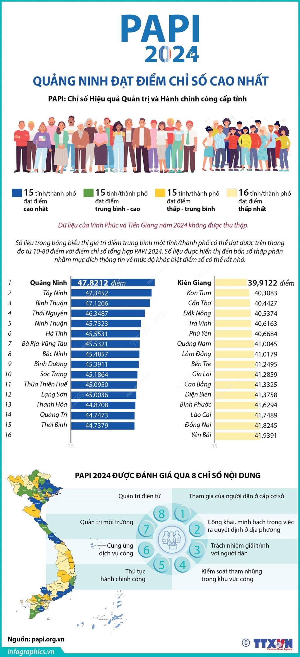 Sáng 15/4/2025, Lễ công bố Chỉ số Hiệu quả quản trị và hành chính công cấp tỉnh (PAPI) năm 2024 đã được tổ chức tại Hà Nội. Theo bảng xếp hạng PAPI 2024, Quảng Ninh được xếp ở nhóm các địa phương đạt điểm số cao nhất và đứng vị trí dẫn đầu toàn quốc với 47,8212 điểm. Xếp thứ 2 và thứ 3 là Tây Ninh và Bình Thuận. Nhóm cuối có thành phố Cần Thơ, tỉnh Kon Tum, Kiên Giang... PAPI là công cụ theo dõi hiệu quả thực thi chính sách, pháp luật của Nhà nước dựa trên ý kiến phản hồi của người dân, được thực hiện từ bên ngoài khu vực Nhà nước. Báo cáo PAPI 2024 đánh dấu chặng đường 16 năm liên tục phát triển của Chỉ số Hiệu quả quản trị và hành chính công cấp tỉnh ở Việt Nam (PAPI) từ 2009 đến 2024.