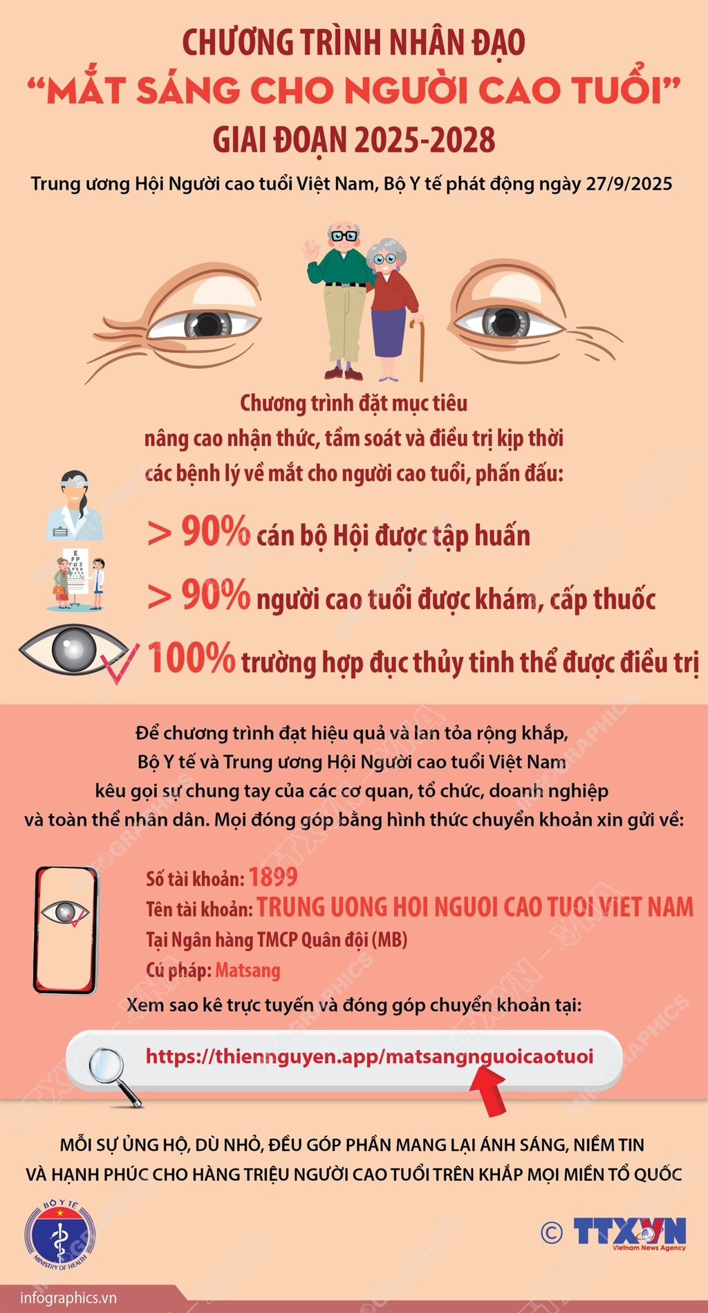 Chương trình nhân đạo “Mắt sáng cho người cao tuổi” giai đoạn 2025-2028 do Trung ương Hội Người cao tuổi Việt Nam phối hợp với Bộ Y tế phát động ngày 27/9/2025. Chương trình tập trung vào các hoạt động: Khám và phát hiện sớm các bệnh lý về mắt như đục thủy tinh thể, tăng nhãn áp, thoái hóa điểm vàng, viêm kết mạc, tật khúc xạ..; Hỗ trợ điều trị, phẫu thuật miễn phí hoặc chi phí thấp cho người cao tuổi có hoàn cảnh khó khăn, người thuộc diện chính sách, vùng sâu vùng xa; Tư vấn, hướng dẫn cách chăm sóc và bảo vệ mắt; cải thiện chất lượng cuộc sống cho người cao tuổi và tăng cường nhận thức cộng đồng về chăm sóc mắt.