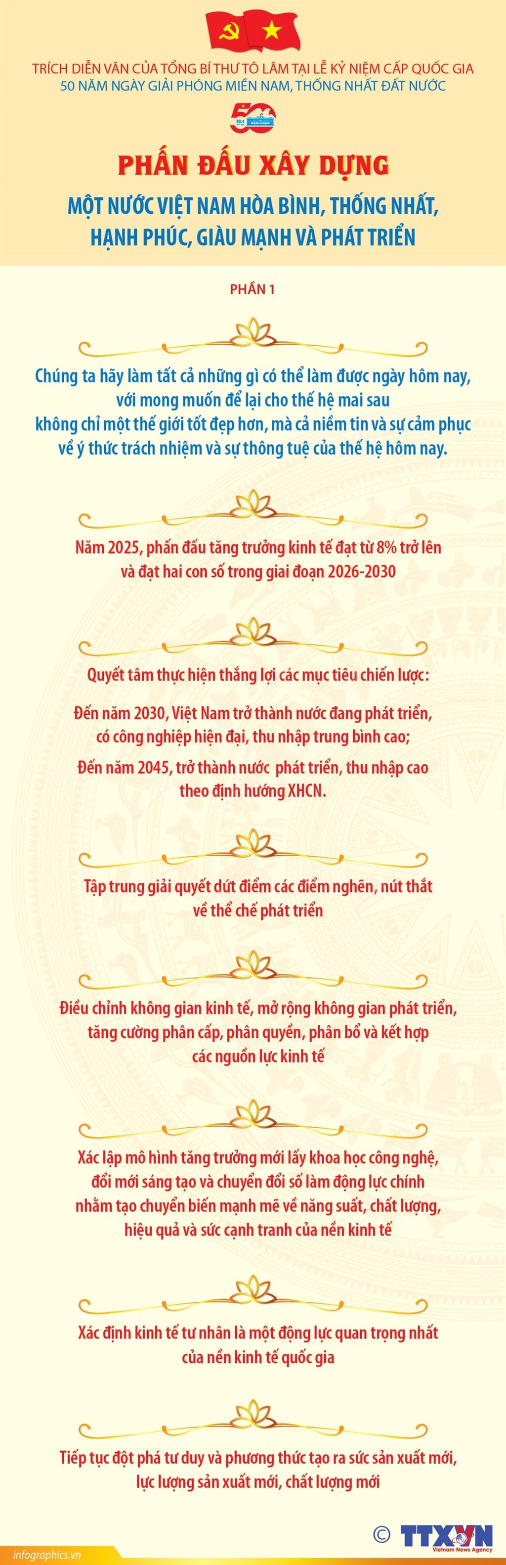 Trong bài diễn văn tại Lễ kỷ niệm cấp quốc gia 50 năm Ngày Giải phóng miền Nam, thống nhất đất nước ngày 30/4/2025, Tổng Bí thư Tô Lâm khẳng định: Là một dân tộc đã trải qua muôn vàn đau thương và tổn thất vì chiến tranh trong quá khứ và cũng là dân tộc được thụ hưởng những lợi ích to lớn từ hòa bình, hợp tác hữu nghị trong những thập kỷ vừa qua. Việt Nam tha thiết mong muốn cùng cộng đồng quốc tế xây dựng một tương lai hòa bình, thịnh vượng, đoàn kết, phát triển. Việt Nam quyết tâm thực hiện thắng lợi các mục tiêu chiến lược đến năm 2030, trở thành nước đang phát triển, có công nghiệp hiện đại, thu nhập trung bình cao; đến năm 2045, trở thành nước phát triển, thu nhập cao theo định hướng XHCN; Triển khai mạnh mẽ chính sách hòa hợp, hòa giải dân tộc với tinh thần chúng ta đều mang dòng máu Lạc Hồng, đều là anh em ruột thịt, “như cây một cội, như con một nhà”; Đẩy mạnh thực hiện phương châm “Việt Nam là bạn, là đối tác tin cậy và là thành viên tích cực, có trách nhiệm của cộng đồng quốc tế”; nỗ lực xây dựng Đảng trong sạch, vững mạnh, toàn diện để Đảng thật sự “là đạo đức, là văn minh”, tiêu biểu cho trí tuệ, danh dự, lương tri của dân tộc và thời đại, xứng đáng với niềm tin, sự lựa chọn và sự kỳ vọng của Nhân dân...